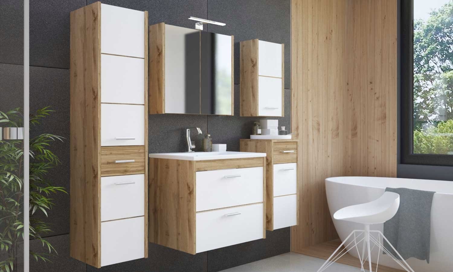 Kolekcja mebli łazienkowych Ibiza White została stworzona z myślą o entuzjastach mocnych kolorów, pomysłowych rozwiązań i unikalnego stylu. Korpusy szafek z kolekcji są w kolorze dębu Wotan, natomiast fronty łączą elementy w kolorze białego połysku z niewielkimi wstawkami w kolorze dębu. W zestawie znajdziemy szafkę niską, wysoką, wiszącą, a także szafkę pod umywalkę o szerokości 60 cm. Bardzo przydatnym elementem kolekcji jest szafka z lustrem, która nie tylko stanowi miejsce do przechowywania, ale również optycznie powiększa łazienkę. Meble z kolekcji Ibiza White zostały zaprojektowane z dużą dozą pomysłowości, jak i dbałością o szczegóły.