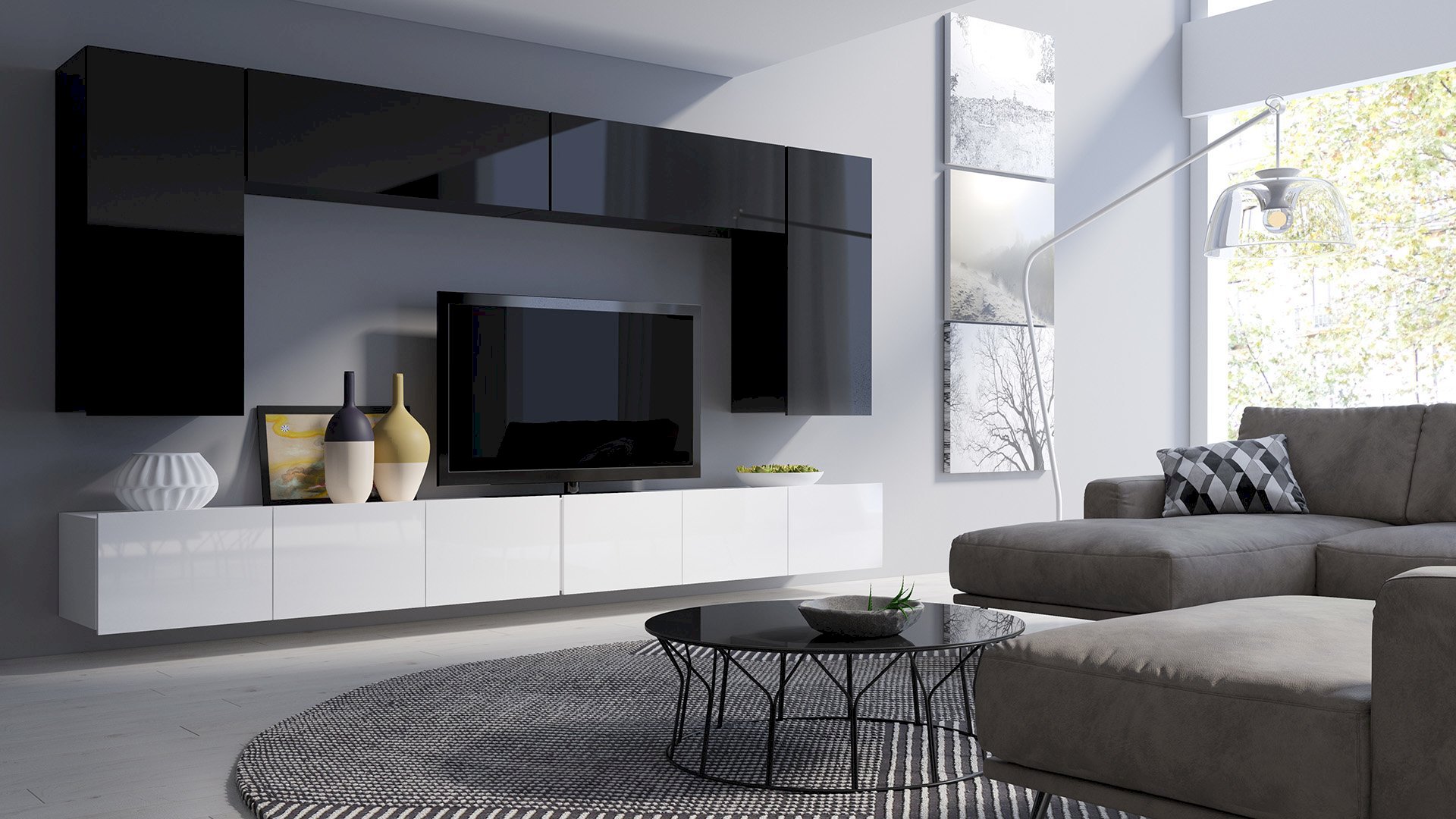 Urządzenie, jakim jest telewizor montujemy najczęściej w salonie, gdzie spoczywa ono na honorowym miejscu, skupiając wokół siebie całą rodzinę oraz naszych gości. Aby był naprawdę efektownie wyeksponowany wymaga atrakcyjnej oprawy w postaci nowoczesnych mebli, wykończonych na wysoki połysk. W naszej ofercie proponujemy zarówno symetryczne, harmonijne konstrukcje, które otoczą urządzenie elegancką ramą, jak i asymetryczne zestawy, wieszane modułowo w linii pionowej. Ich kolorystyka może być łączona dowolnie w kombinacjach bieli oraz czerni, bądź też jednolicie.