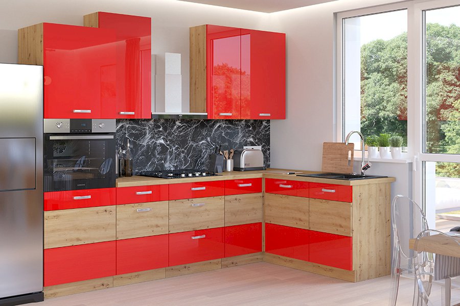 Nowoczesne meble kuchenne Artisan czerwony połysk to doskonałe rozwiązanie dla kuchni w minimalistycznym, prostym stylu. System składa się z modułów do samodzielnego skompletowania i montażu. W ofercie dostępne są szafki górne, dolne, szuflady narożniki oraz słupki. Pojedyncze elementy zestawu umożliwiają prosty montaż według załączonej instrukcji. Wszystkie podane wymiary modułów systemu są wymiarami zewnętrznymi i podane są w centymetrach. Meble wyróżniają się wysokiej jakości materiałami wykonania, które dostosowane są do użytku kuchennego. Laminaty odporne są na wilgoć i temperaturę, a blaty również na zarysowania. Komfort użytkowania podnoszą solidne, trwałe uchwyty, okucia z cichym domykiem i fronty MDF.