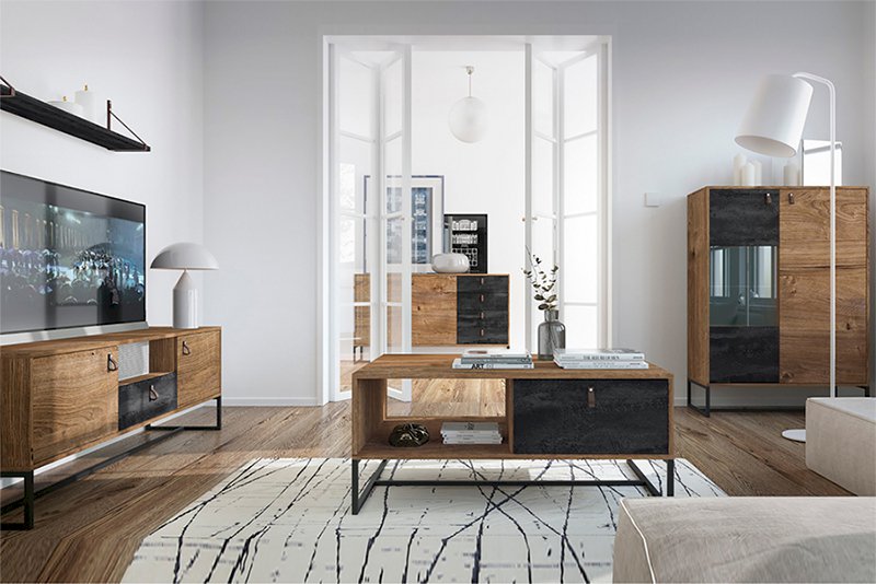 Kontrastowe połączenie czarnej podstawy z dwoma kolorami dekorów, nada Twojemu wnętrzu nietuzinkowego stylu. Całość formy dopełnia skórzany uchwyt z mosiężnym mocowaniem. Prosta forma mebli znajdzie zastosowanie w zarówno małych jak i dużych wnętrzach. Dzięki wielości brył dostępnych w kolekcji na pewno nie zabraknie pomysłu na ciekawą aranżacje. Jeżeli myślisz o prostym wnętrzu postaw na – Dark.