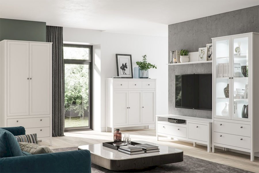 Kolekcja OLE to rozwiązanie dla osób, które chcą uporządkować przestrzeń bez przeładowania wnętrza ciężkimi bryłami. Jasna kolorystyka optycznie powiększa pomieszczenie i wprowadza poczucie ładu już od progu. Modułowa budowa pozwala zestawić komody, witryny, regały czy szafy w taki sposób, aby maksymalnie wykorzystać dostępną ścianę – nawet w mniejszym salonie lub pokoju dziennym.