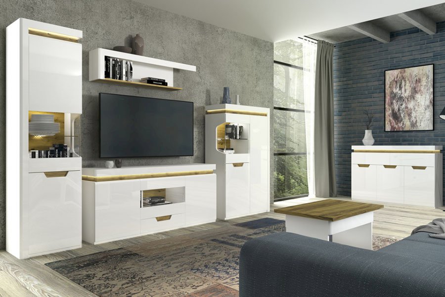 Kolekcja Torino zapewne zachwyci miłośników nowoczesnych rozwiązań, oryginalnych wnętrz i nowatorskich pomysłów! Cechą charakterystyczną tych mebli jest asymetryczność, która wyróżnia je na tle pozostałych kolekcji. Nietypowa struktura została podkreślona przez podświetlone elementy w odcieniu ciepłego dębu nawarro oraz strefy witrynowe przeszklone z dwóch stron, które dodatkowo zachowane są w nieregularnej i asymetrycznej kompozycji. Na estetyce i ciekawych dodatkach zalety kolekcji Torino się nie kończą. Meble dzięki formie oraz przemyślanemu projektowi spełniają swoje wszystkie podstawowe funkcje, którymi charakteryzują się meble wygodne w użytkowaniu: są pakowne, łatwe w aranżacji i przeznaczone do niemal każdego nowoczesnego pokoju dziennego!