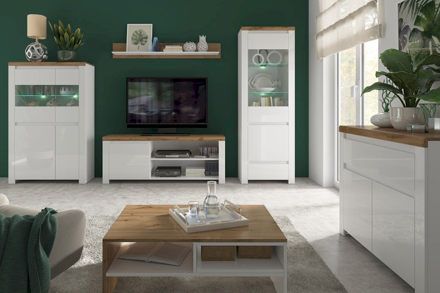 Systemowa budowa pozwala ustawić meble w jednej linii lub podzielić je na strefy: RTV, przechowywania i ekspozycji. Dzięki temu nawet w średnim metrażu zyskujesz uporządkowaną przestrzeń. Szafki RTV zapewniają stabilne miejsce na telewizor i sprzęt multimedialny, a przemyślane otwory i półki ułatwiają organizację przewodów.