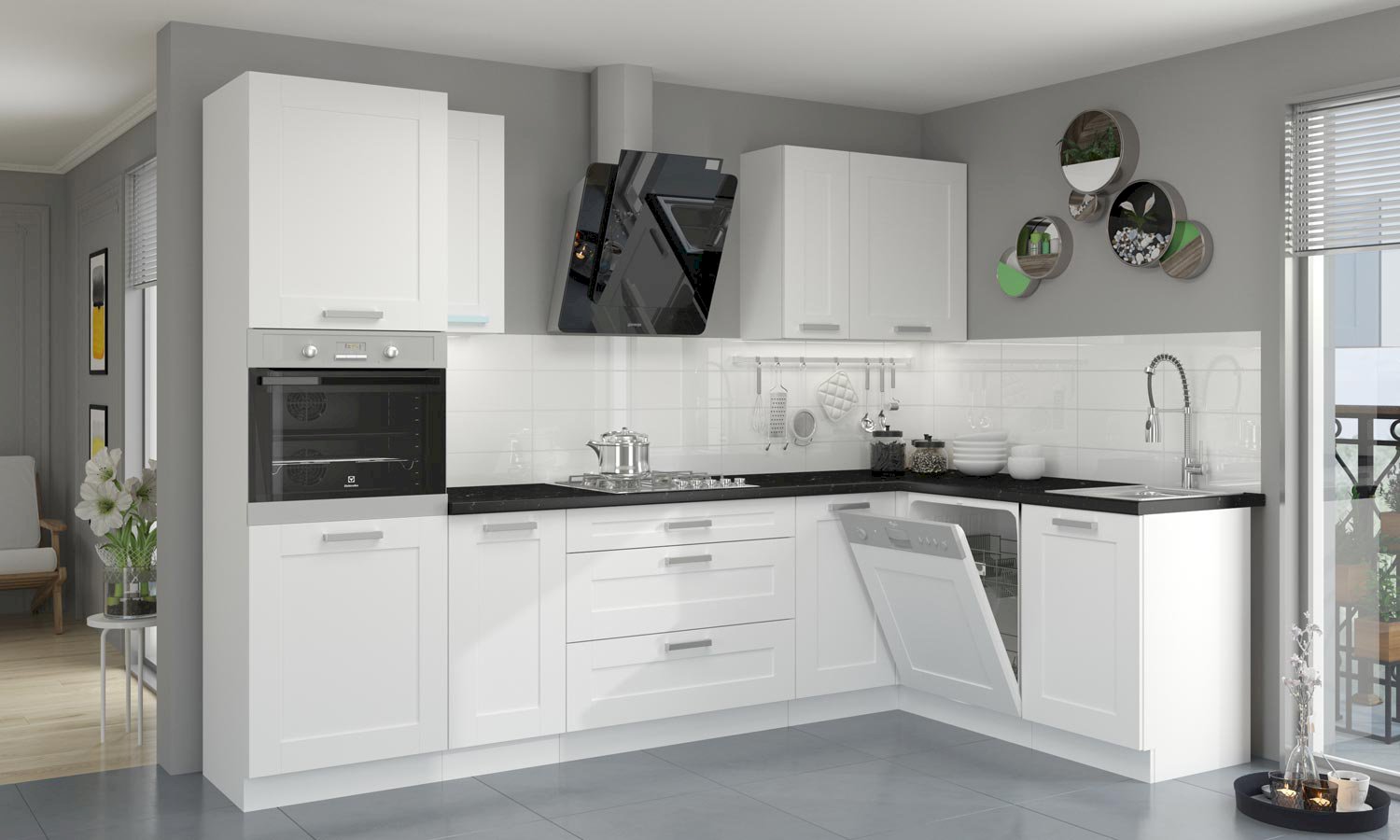 Korpusy mebli utrzymane są w równie białym odcieniu, co tworzy spójny i harmonijny wygląd całej kolekcji. Płyta laminowana o grubości 16 mm, z której wykonane są meble, zapewnia trwałość, odporność na wilgoć oraz łatwość w utrzymaniu czystości, co jest istotne w kuchennym środowisku.
