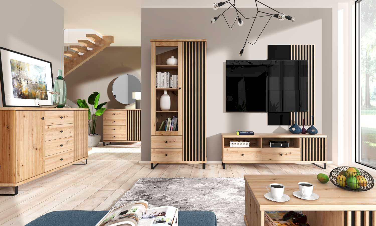 Komody, witryny i szafki RTV zostały zaprojektowane tak, aby ułatwić organizację przestrzeni. Pojemne wnętrza pozwalają schować dokumenty, tekstylia i akcesoria, a przeszklone elementy eksponują to, co chcesz mieć pod ręką. Wysokość blatów i głębokość półek dopasowano do realnego użytkowania – bez zbędnych kompromisów.