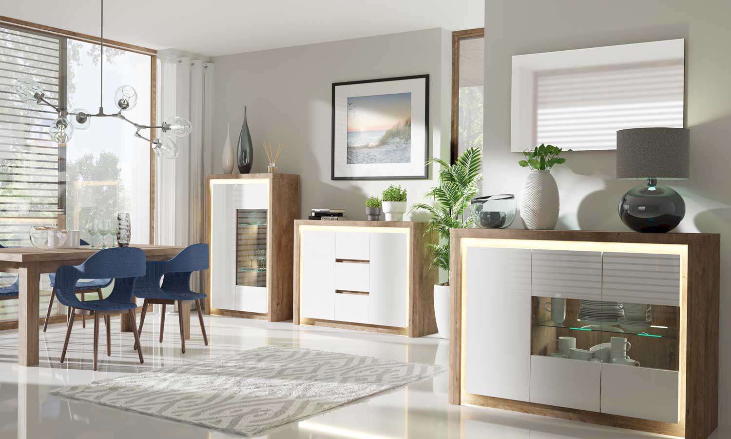 Kolekcja mebli Livinio łączy eleganckie elementy wzornicze z innowacyjnymi funkcjami, tworząc nowoczesny i efektowny wizualnie wygląd. Białe fronty z połyskiem dodają elegancji i refleksów, natychmiast rozjaśniając i otwierając Twój salon. Podświetlany górny blat i boki dodatkowo wzmacniają efekt wizualny, tworząc hipnotyzującą atmosferę, która dodaje odrobinę luksusu do Twojej przestrzeni.