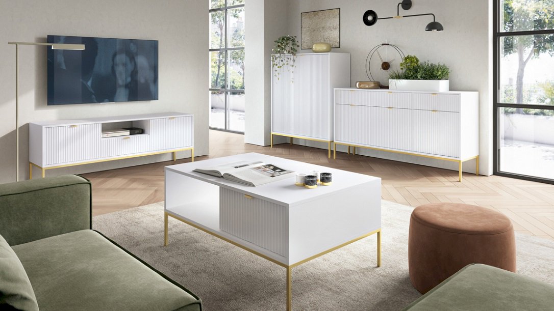Salon, w którym łatwo się odpoczywa, zaczyna się od dobrze dobranych mebli. Meble do salonu Nova biały mat rozjaśniają przestrzeń i pomagają utrzymać porządek bez zbędnych dekoracji.