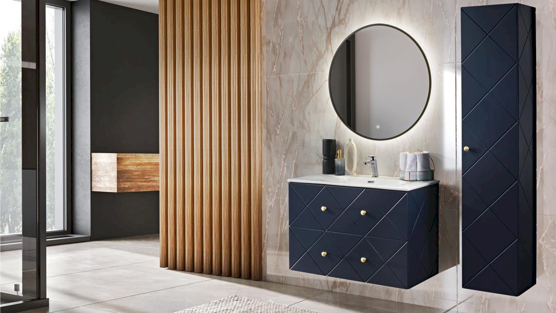 Szafka wisząca wyposażona w oświetlenie LED dodaje meblom funkcjonalności i efektownego oświetlenia. To eleganckie i praktyczne rozwiązanie, które podkreśla nowoczesny charakter mebli Elegance Blue, tworząc stylową aranżację łazienki.