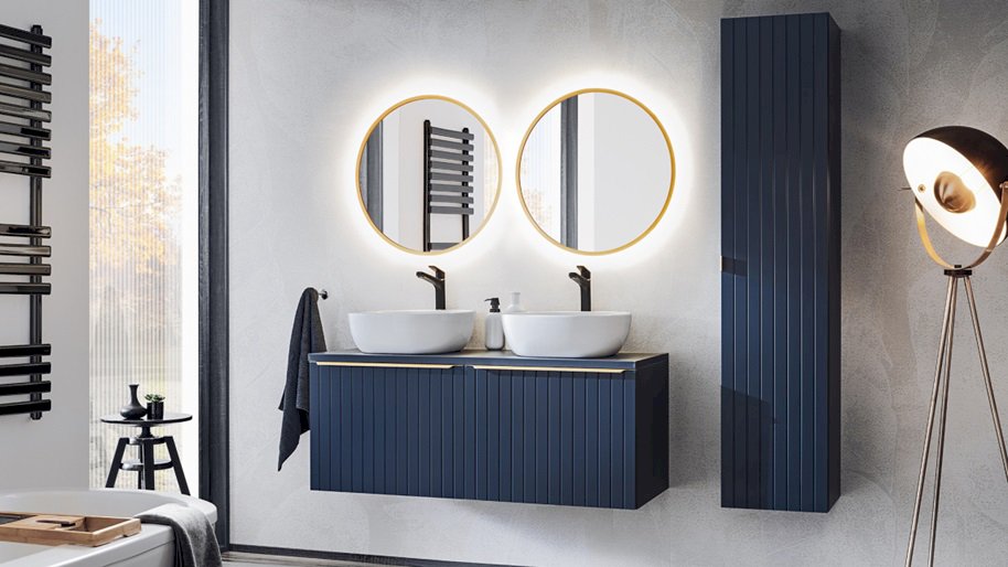 Mebelki łazienkowe Santa Fe Deep Blue to nowoczesne i efektowne rozwiązanie, które wnosi do łazienki elegancję i styl. Fronty z MDF prezentują gładką i estetyczną powierzchnię, a intensywny kolor niebieski indigo korpusu z płyty laminowanej dodaje meblom wyrazistego charakteru.