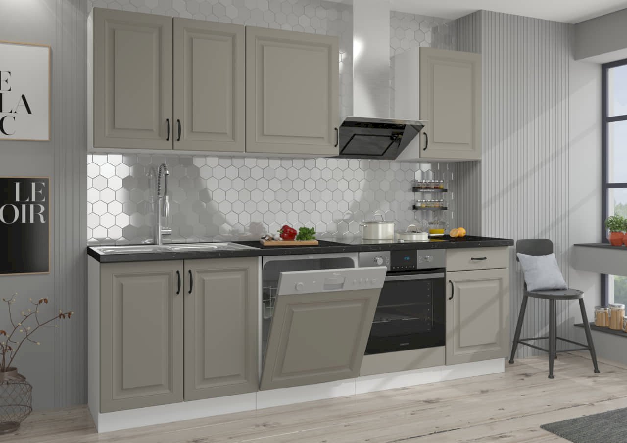 Kolekcja mebli Stilo Clay Grey + Biały Mat to idealne rozwiązanie dla tych, którzy poszukują kuchni łączącej nowoczesny design z praktycznym podejściem. Korpus w uniwersalnym białym kolorze wykonany z solidnej płyty laminowanej zapewnia trwałość i wszechstronność, tworząc bazę dla funkcjonalnej przestrzeni.