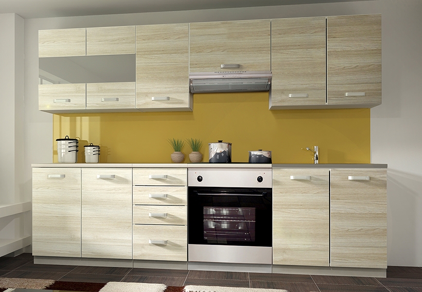 Eko Akacja to nowoczesne meble kuchenne wykonane z wysokiej jakości materiałów odpowiednich do zastosowania w kuchni. Laminaty o zwiększonej odporności na temperaturę, zarysowania i wilgoć, wytrzymały, gruby blat oraz solidne uchwyty zapewnią funkcjonalność i komfort użytkowania. System umożliwia dopasowanie pojedynczych modułów do własnej kuchni lub zakup gotowego zestawu. W ofercie systemu Eko Akacja znaleźć można szeroki wybór szafek dolnych i górnych, narożników oraz szuflad w standardowych szerokościach. Atutem jest również nowoczesna kolorystyka w odcieniu jasnego drewna – na ekranie monitora kolory mogą różnić się od rzeczywistych kolorów oferowanych mebli.