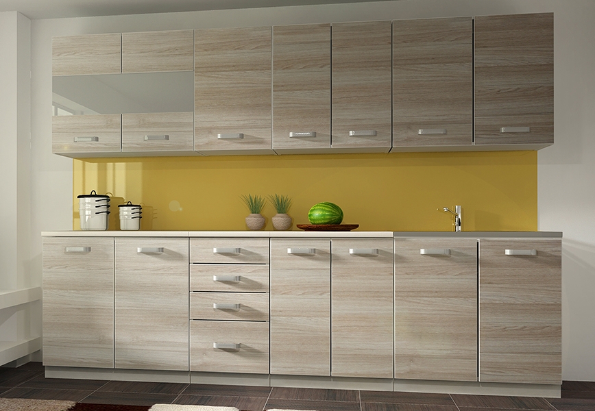 Nowoczesne meble kuchenne w odcieniu jasnego drewna to aktualnie jeden z najsilniejszych trendów w meblarstwie. Eko-Hiteak to system wykonany z wysokiej jakości laminatów odpowiednich do zastosowania w kuchni. Materiały PCV o zwiększonej odporności na temperaturę, zarysowania i wilgoć, podnoszą komfort użytkowania. Proponowany zestaw posiada również wytrzymały, gruby blat w kolorze jasnej sosny, który zapewni wygodne przygotowywanie posiłków. Na funkcjonalność mebli wpływa również zastosowanie chwytów z wysokogatunkowego tworzywa. Możesz kupić gotowy zestaw Eko Hiteak lub skomponować go samodzielnie - dostępne szafki znajdują się pod opisem.