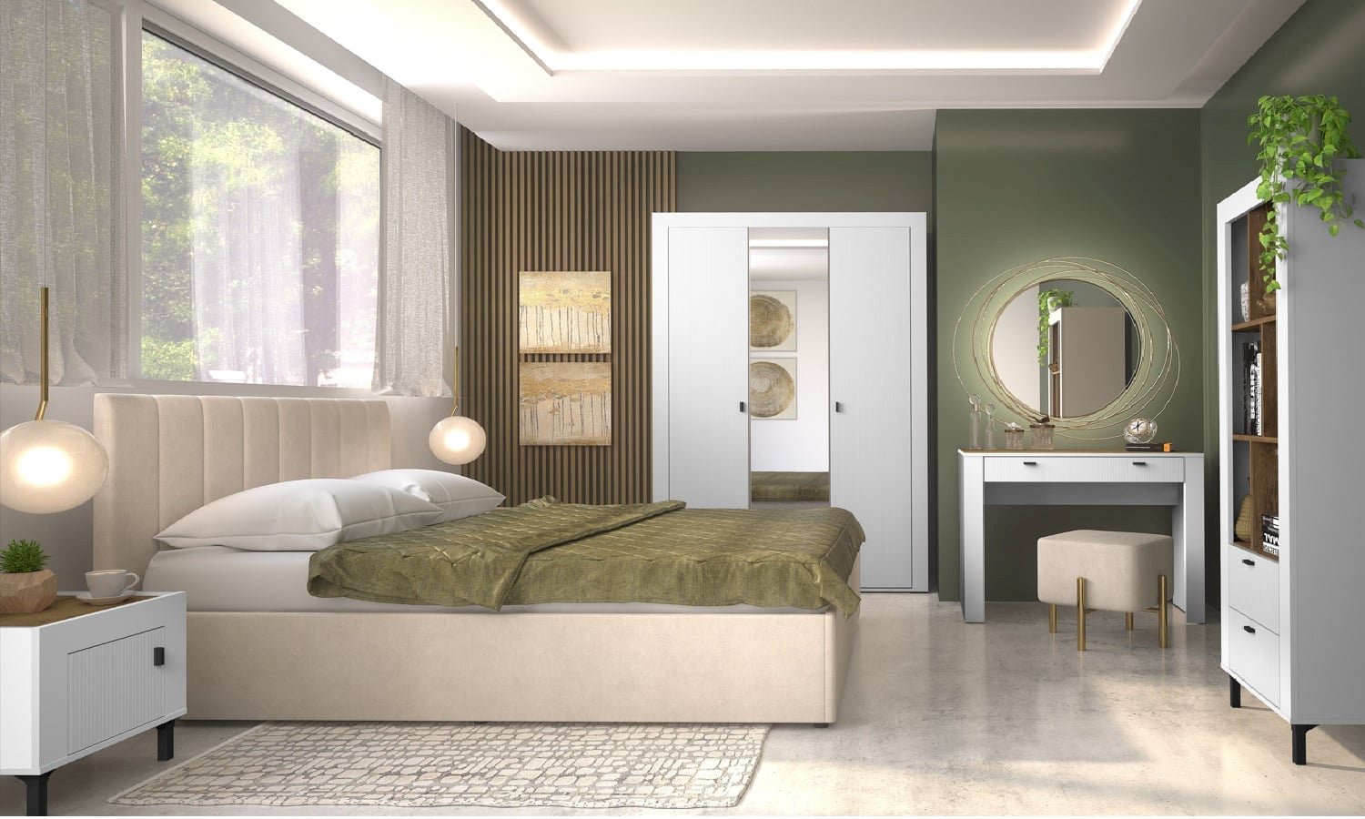 Zestaw Mossa obejmuje wszystko, czego potrzeba, by stworzyć kompletną i praktyczną sypialnię: wygodne łóżko z tapicerowanym zagłówkiem, pojemną szafę z lustrem, toaletkę z lustrem oraz funkcjonalne szafki nocne. Każdy element został zaprojektowany tak, by tworzył spójną i elegancką całość.