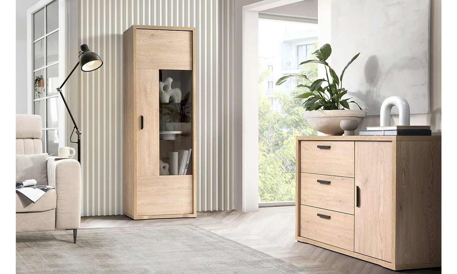 Kolekcja Grande producenta Jarstol to nowoczesne meble do salonu i jadalni, które łączą naturalne wybarwienie dębu z minimalistyczną formą i funkcjonalnymi rozwiązaniami. Proste bryły, subtelne frezowania oraz kontrastujące, ciemne uchwyty nadają całości elegancki, ponadczasowy charakter. Meble Grande doskonale wpisują się w aranżacje w stylu nowoczesnym, skandynawskim oraz japandi. Jasny dekor drewna ociepla wnętrze, a przeszklone fronty wybranych brył pozwalają wyeksponować dekoracje, książki czy zastawę stołową. Kolekcja została zaprojektowana z myślą o kompleksowym wyposażeniu strefy dziennej – obejmuje witryny, komody, szafkę RTV oraz stolik kawowy. Dzięki przemyślanemu układowi półek i szuflad meble Grande oferują dużo miejsca do przechowywania, pomagając utrzymać porządek w salonie. Solidne wykonanie i starannie dobrane materiały gwarantują trwałość oraz komfort użytkowania na lata. Postaw na kolekcję Grande i stwórz harmonijną, elegancką przestrzeń do codziennego relaksu.