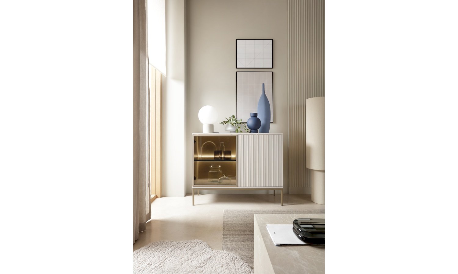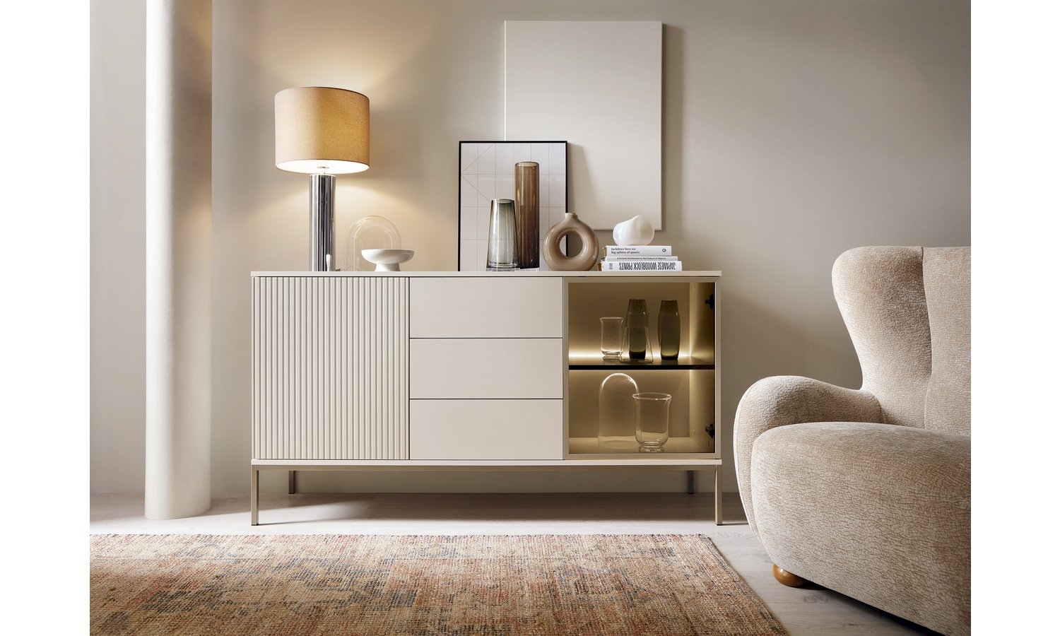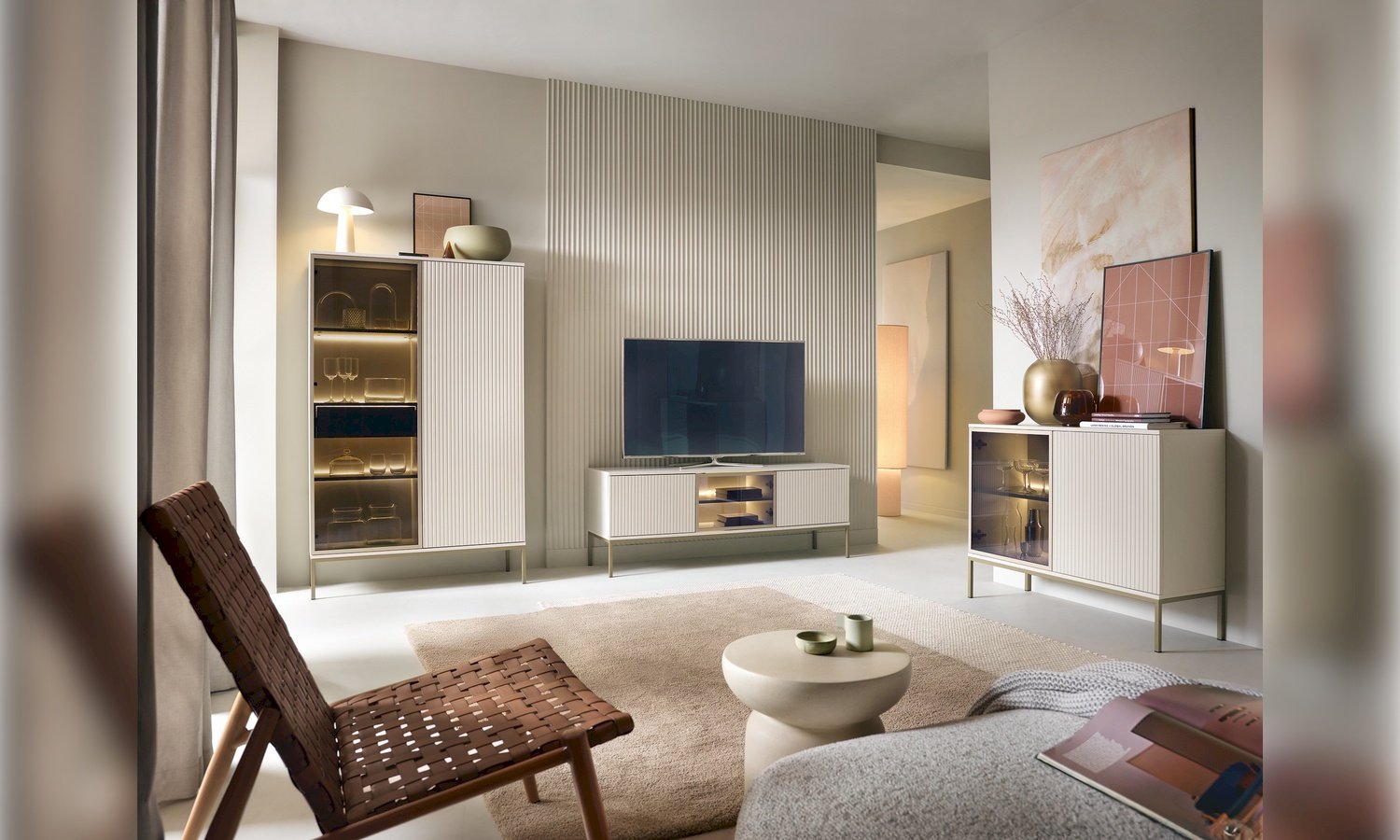 Kolekcja Sento w kolorze kaszmir + dąb wotan to propozycja dla osób ceniących nowoczesną elegancję w ciepłym, przytulnym wydaniu. Subtelny odcień kaszmiru nadaje bryłom lekkości i ponadczasowego charakteru, natomiast dekor dąb wotan wprowadza naturalny akcent inspirowany strukturą drewna. Połączenie tych dwóch kolorów tworzy harmonijną kompozycję, która doskonale sprawdzi się zarówno w salonie, jak i jadalni czy pokoju dziennym. Kolekcja Sento wyróżnia się: nowoczesną, geometryczną formą, stonowaną i modną kolorystyką, funkcjonalnymi rozwiązaniami do przechowywania oraz trwałą konstrukcją z wysokiej jakości płyty meblowej. Matowe fronty w kolorze kaszmiru zestawione z ciepłym odcieniem dębu wotan tworzą elegancki kontrast, który nadaje wnętrzu przytulności bez efektu przytłoczenia. To idealna baza do aranżacji w stylu nowoczesnym, soft loft, modern classic czy contemporary. Kolekcja Sento pozwala stworzyć spójną, estetyczną przestrzeń – od strefy RTV, przez jadalnię, aż po elegancką przestrzeń do przechowywania.