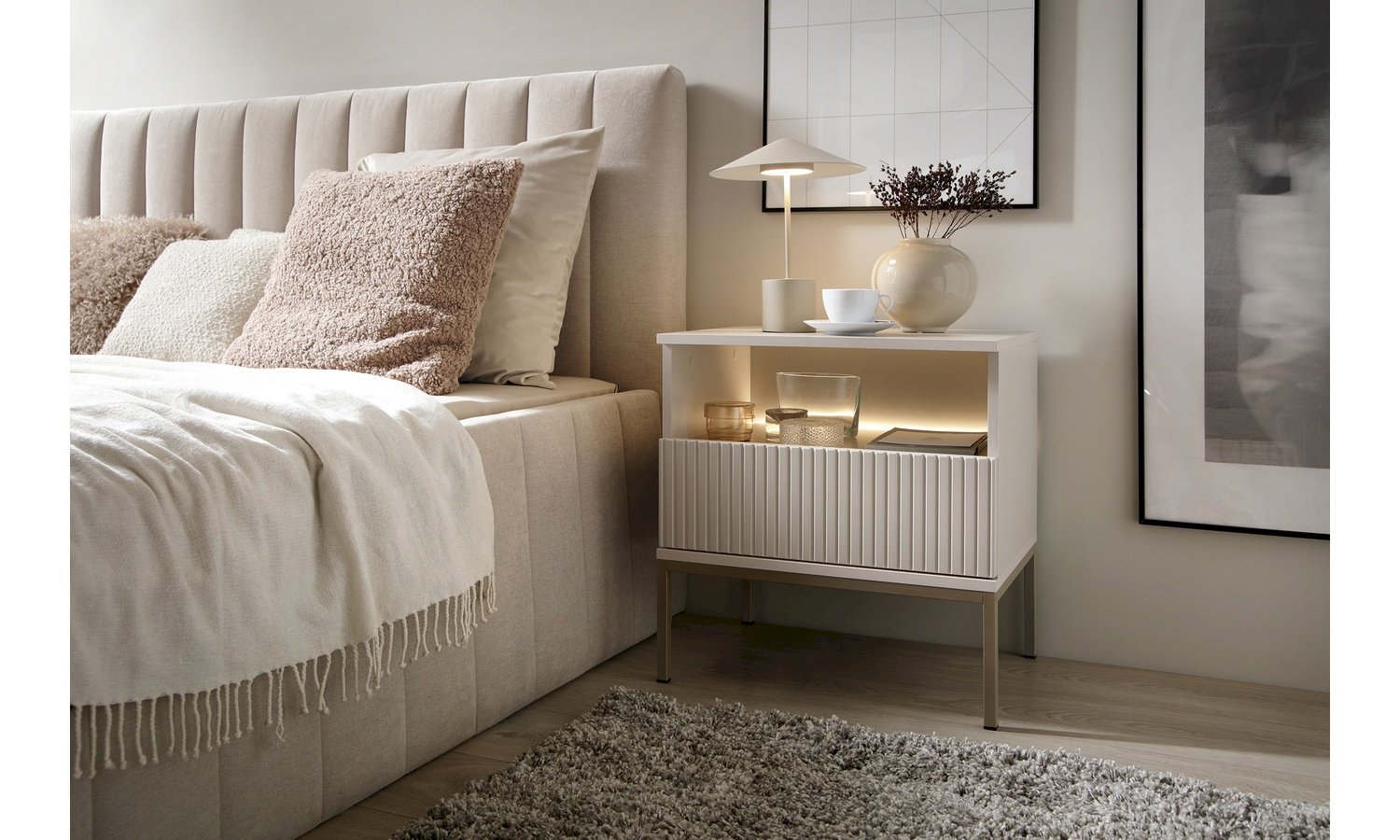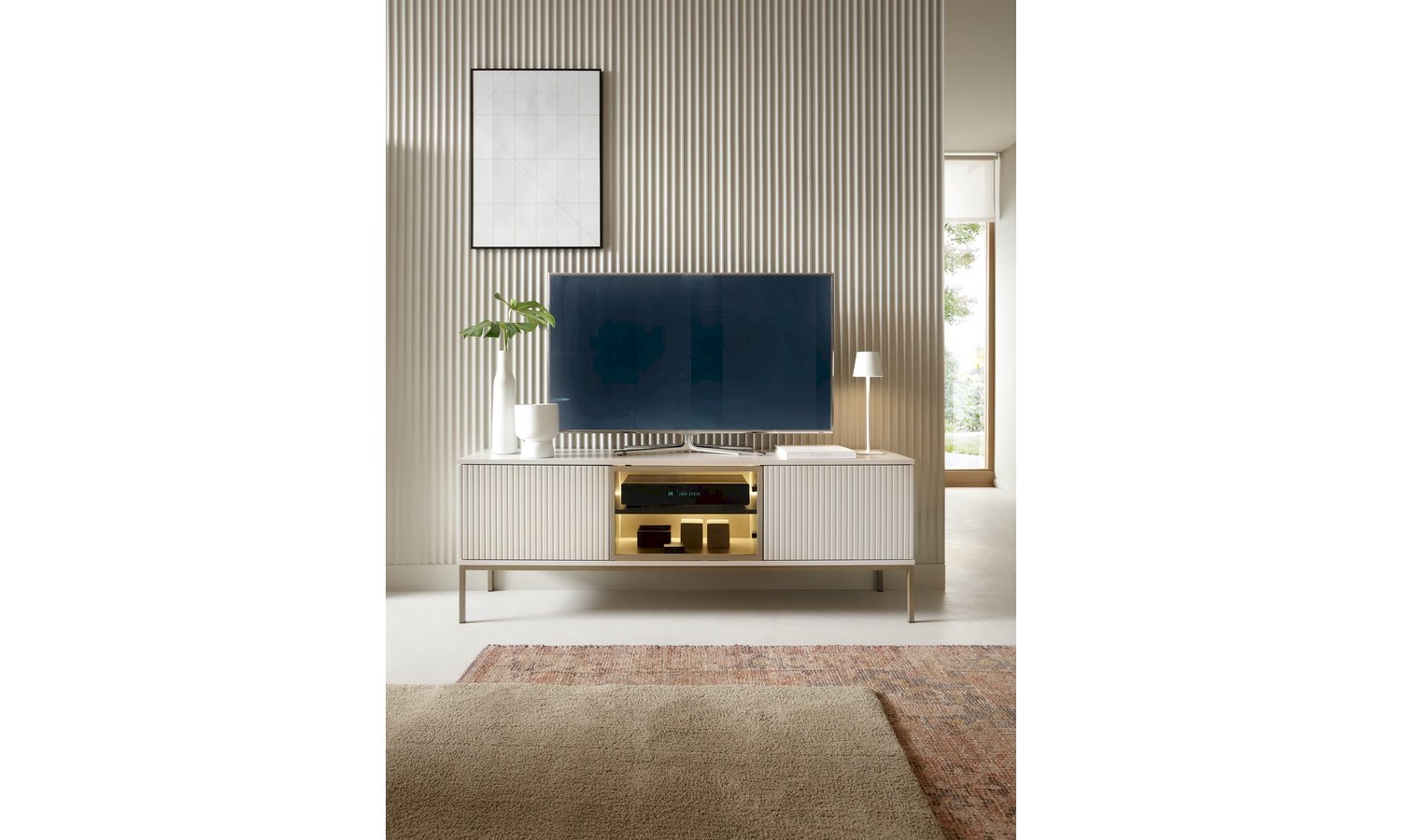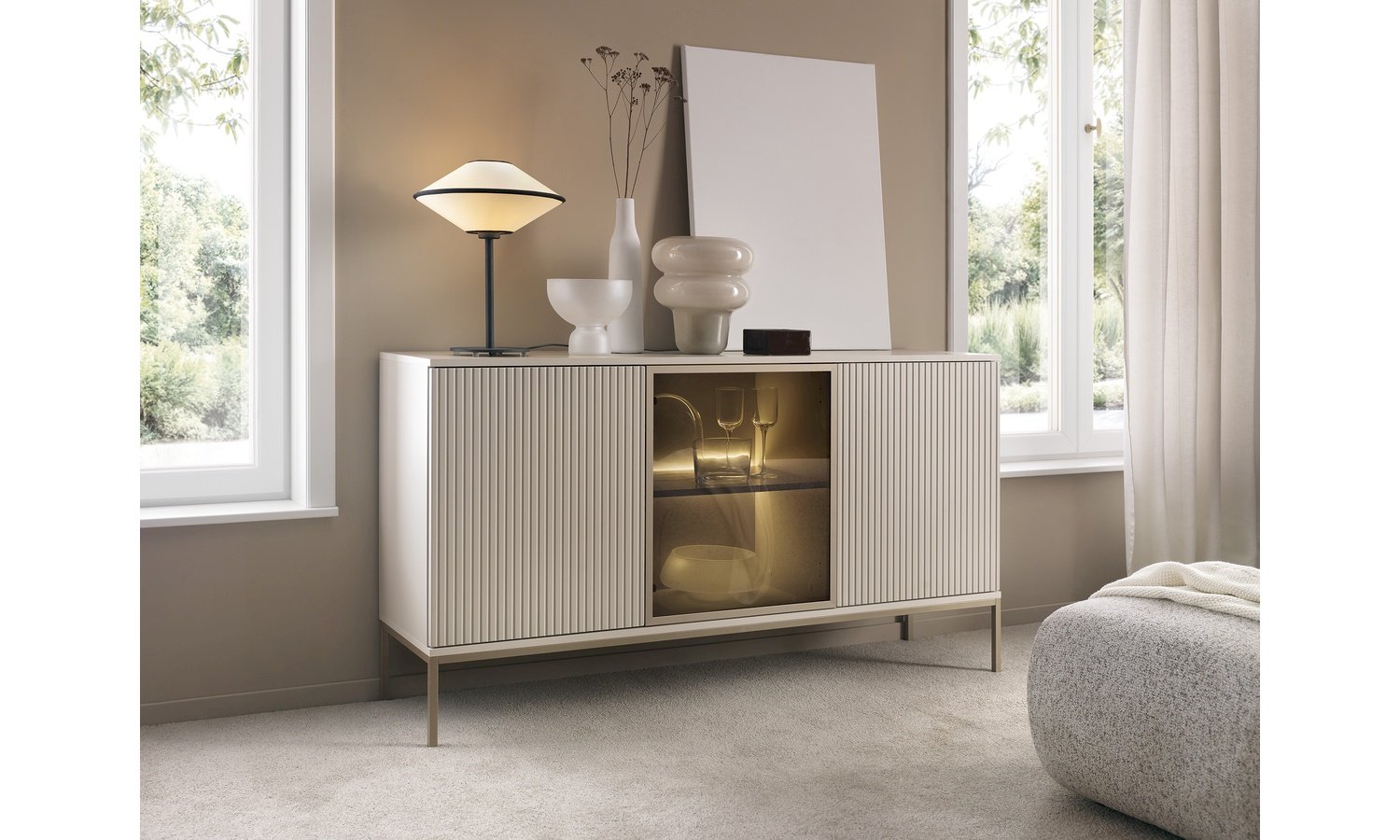 Kolekcja Sento w kolorze kaszmir + dąb wotan to propozycja dla osób ceniących nowoczesną elegancję w ciepłym, przytulnym wydaniu. Subtelny odcień kaszmiru nadaje bryłom lekkości i ponadczasowego charakteru, natomiast dekor dąb wotan wprowadza naturalny akcent inspirowany strukturą drewna. Połączenie tych dwóch kolorów tworzy harmonijną kompozycję, która doskonale sprawdzi się zarówno w salonie, jak i jadalni czy pokoju dziennym. Kolekcja Sento wyróżnia się: nowoczesną, geometryczną formą, stonowaną i modną kolorystyką, funkcjonalnymi rozwiązaniami do przechowywania oraz trwałą konstrukcją z wysokiej jakości płyty meblowej. Matowe fronty w kolorze kaszmiru zestawione z ciepłym odcieniem dębu wotan tworzą elegancki kontrast, który nadaje wnętrzu przytulności bez efektu przytłoczenia. To idealna baza do aranżacji w stylu nowoczesnym, soft loft, modern classic czy contemporary. Kolekcja Sento pozwala stworzyć spójną, estetyczną przestrzeń – od strefy RTV, przez jadalnię, aż po elegancką przestrzeń do przechowywania.