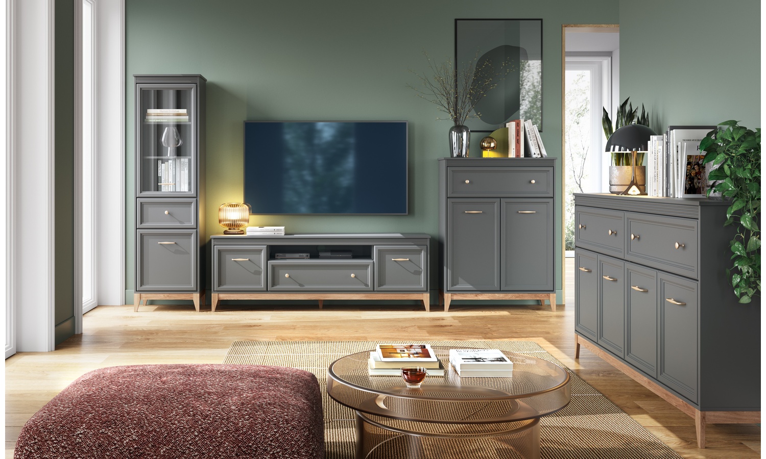 Kolekcja Terra w kolorze szary diamentowyto harmonijne połączenie nowoczesnego designu, subtelnej elegancji oraz funkcjonalności dopasowanej do współczesnych wnętrz. Stonowana, głęboka szarość frontów podkreślona delikatnymi frezowaniami i złotymi uchwytami tworzy efekt luksusu, który doskonale wpisuje się w trendy wnętrzarskie.Wyważone proporcje brył oraz naturalne akcenty drewnianych podstaw nadają meblom lekkości, dzięki czemu kolekcja Terra świetnie sprawdzi się zarówno w salonie, jadalni, jak i sypialni. Kolekcja Terra to propozycja dla osób, które poszukują mebli stylowych, trwałych i ponadczasowych. Połączenie modnej kolorystyki, subtelnych detali oraz funkcjonalnych rozwiązań sprawia, że meble zachowują swój elegancki wygląd przez lata. To idealny wybór dla miłośników minimalistycznej elegancji i wysokiej jakości wykonania.