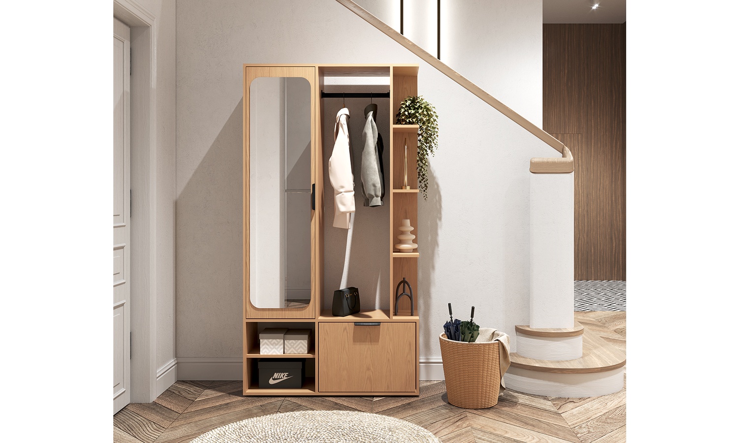Garderoba Nalato nowoczesne rozwiązanie stworzone z myślą o uporządkowanej i estetycznej przestrzeni wejściowej. Przemyślana konstrukcja łączy w sobie funkcję szafy, lustra, wieszaka oraz praktycznych półek, dzięki czemu pozwala wygodnie przechowywać odzież wierzchnią, obuwie i codzienne akcesoria w jednym miejscu. Minimalistyczna forma oraz modne wybarwienia sprawiają, że mebel doskonale wpisuje się w aktualne trendy aranżacyjne i pasuje zarówno do nowoczesnych, jak i bardziej klasycznych wnętrz.Duże lustro optycznie powiększa przestrzeń i pozwala wygodnie przygotować się do wyjścia z domu, a otwarta część z drążkiem umożliwia szybki dostęp do najczęściej używanych kurtek i płaszczy. Dodatkowe półki zapewniają miejsce na torebki, dekoracje lub praktyczne organizery, natomiast zamykana szafka pozwala ukryć obuwie lub inne elementy garderoby, pomagając zachować porządek w przedpokoju. Dzięki kompaktowej formie garderoba Nala doskonale sprawdzi się zarówno w mniejszych mieszkaniach, jak i w przestronnych wnętrzach, gdzie liczy się wygoda użytkowania i estetyczna spójność wyposażenia.Model dostępny jest w kilku starannie dobranych wariantach kolorystycznych, co pozwala dopasować mebel do indywidualnego stylu aranżacji.Biel alpejskapodkreśla lekkość i świeżość wnętrza,kaszmirwprowadza subtelną elegancję,szary diamentowynadaje nowoczesnego charakteru, natomiast dekordąb bookmatchinspirowany naturalnym rysunkiem drewna ociepla przestrzeń i dodaje jej przytulności. Każda wersja kolorystyczna została zaprojektowana tak, aby harmonijnie współgrała z innymi elementami wyposażenia domu.Garderoba Nala to idealne połączenie estetyki i funkcjonalności, które ułatwia codzienną organizację przestrzeni i pozwala stworzyć uporządkowane, stylowe wejście do domu. To doskonały wybór dla osób, które cenią praktyczne rozwiązania, nowoczesny design oraz wysoką jakość wykonania.