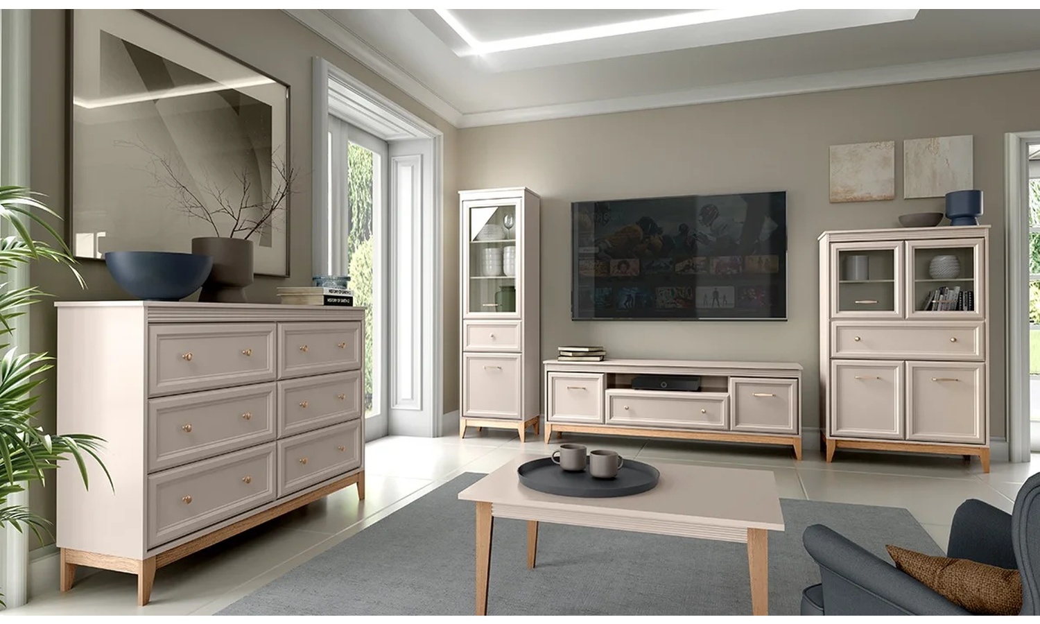 Wprowadź do swojego salonu harmonię, elegancję i ponadczasowy styl dzięki kolekcji mebli Windsor w modnym odcieniu kaszmiru. To wyjątkowe połączenie klasycznego designu z nowoczesną funkcjonalnością, które doskonale sprawdzi się w stylowych, przytulnych wnętrzach. Ciepły, subtelny kolor kaszmir nadaje przestrzeni lekkości i elegancji, jednocześnie tworząc przyjazną atmosferę sprzyjającą relaksowi. Charakterystyczne frezowane fronty, delikatne uchwyty oraz wysokie, drewniane nóżki podkreślają wyrafinowany charakter kolekcji i dodają jej wizualnej lekkości.Meble Windsor do salonu to przemyślany zestaw, który pozwala stworzyć spójną i funkcjonalną aranżację. W skład kolekcji wchodzą m.in. pojemna komoda, elegancka witryna, praktyczna szafka RTV oraz dodatkowe elementy do przechowywania. Dzięki nim z łatwością uporządkujesz przestrzeń, eksponując jednocześnie dekoracje, książki czy zastawę.To idealny wybór dla osób, które cenią styl, jakość i wygodę użytkowania. Meble zostały zaprojektowane tak, aby sprostać codziennym potrzebom, zachowując przy tym estetykę na najwyższym poziomie.Postaw na kolekcję Windsor w kolorze kaszmir i stwórz salon, który zachwyca elegancją oraz funkcjonalnością każdego dnia.