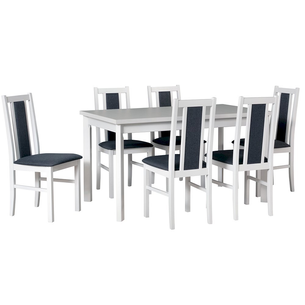 Przedmiotem oferty jest nowoczesny i stylowy zestaw pokojowy składający się ze stołu rozkładanego Modena I i sześciu krzeseł Boss XIV, renomowanej i cenionej w Europie firmy Drewmix. Stół ten posiada blat laminowany oraz skrzynię wraz z nogami wykonaną z litego drewna bukowego odpornego na zarysowania wilgoć i wysoką temperaturę, wykończonego bejcami i lakierami wodnymi. Materiały te i solidne wykonanie gwarantują, że produkt będzie dobrze służyć przez długi czas. W zestawie znajduje się wkładka 40 cm pozwalająca na rozłożenie stołu do 180 cm.