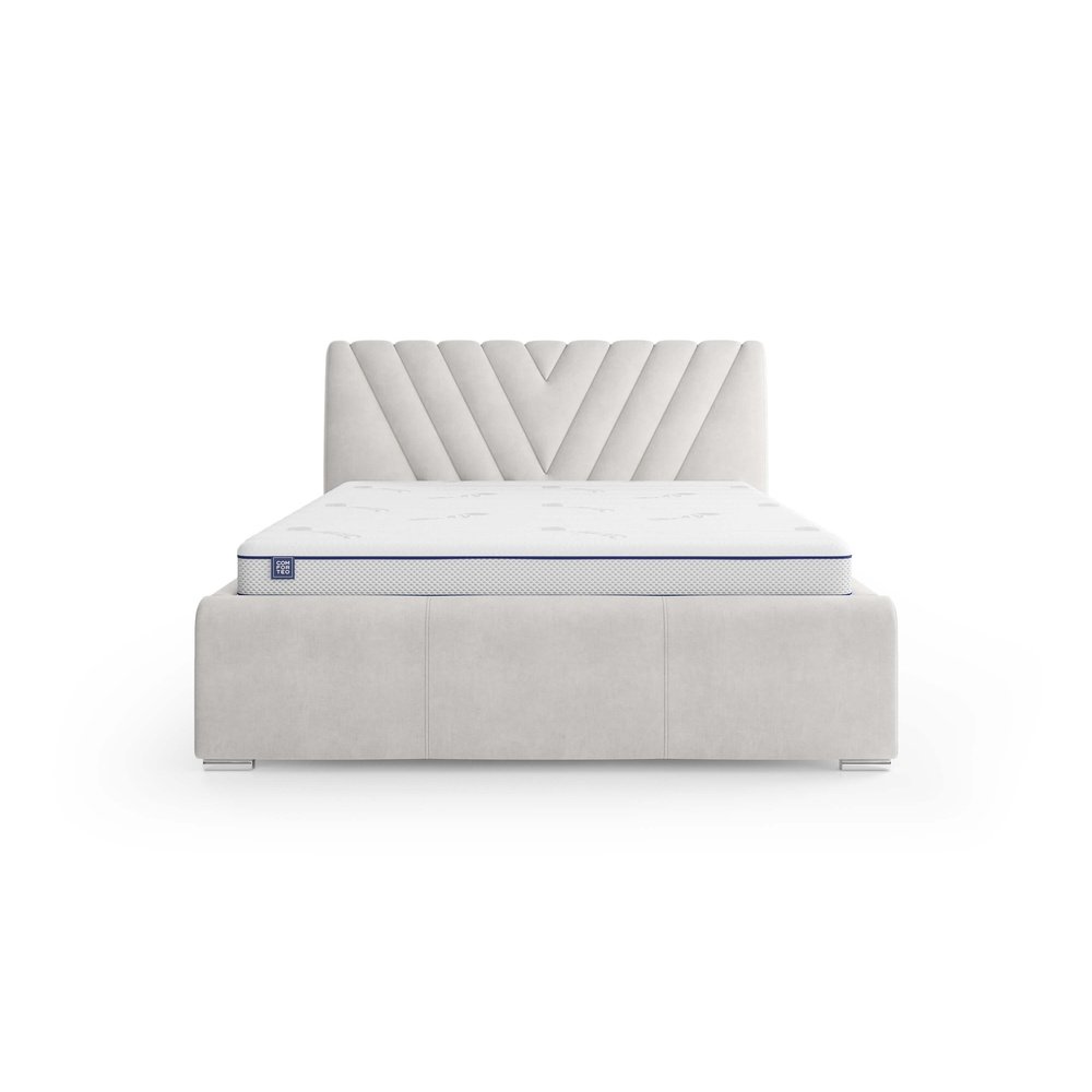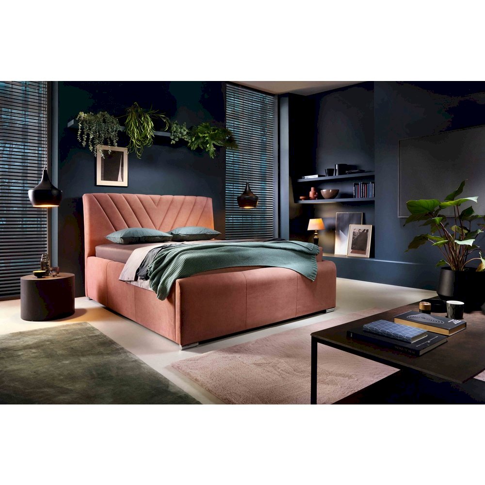 Nevada zachwyca uniwersalnym charakterem oraz funkcjonalnością, którą zapewnia komfortowa konstrukcja mebla. Pokaźne gabaryty łóżka pozwoliły konstruktorom w jego wnętrzu umieścić olbrzymi pojemnik na pościel. Imponująca wysokość powierzchni spania jeszcze bardziej zwiększa komfort odpoczynku oraz ułatwia wstawanie z łóżka, co z całą pewnością docenią osoby starsze. Warto zwrócić również uwagę na wezgłowie z efektownymi przeszyciami, wprowadzającymi użytkowników w odprężający nastrój. Całość gwarantuje najwyższy komfort odpoczynku. Bryła łóżka opiera się na niskich, chromowanych nóżkach, które nadają bryle stylowy charakter. Nevada świetnie prezentuje się zarówno w jasnych, jak i ciemnych tkaninach tapicerskich, które uwydatniają zdobienia wezgłowia. Wysokość wezgłowia, kształty płóz oraz wysokość nóżek nie podlegają personalizacji.
