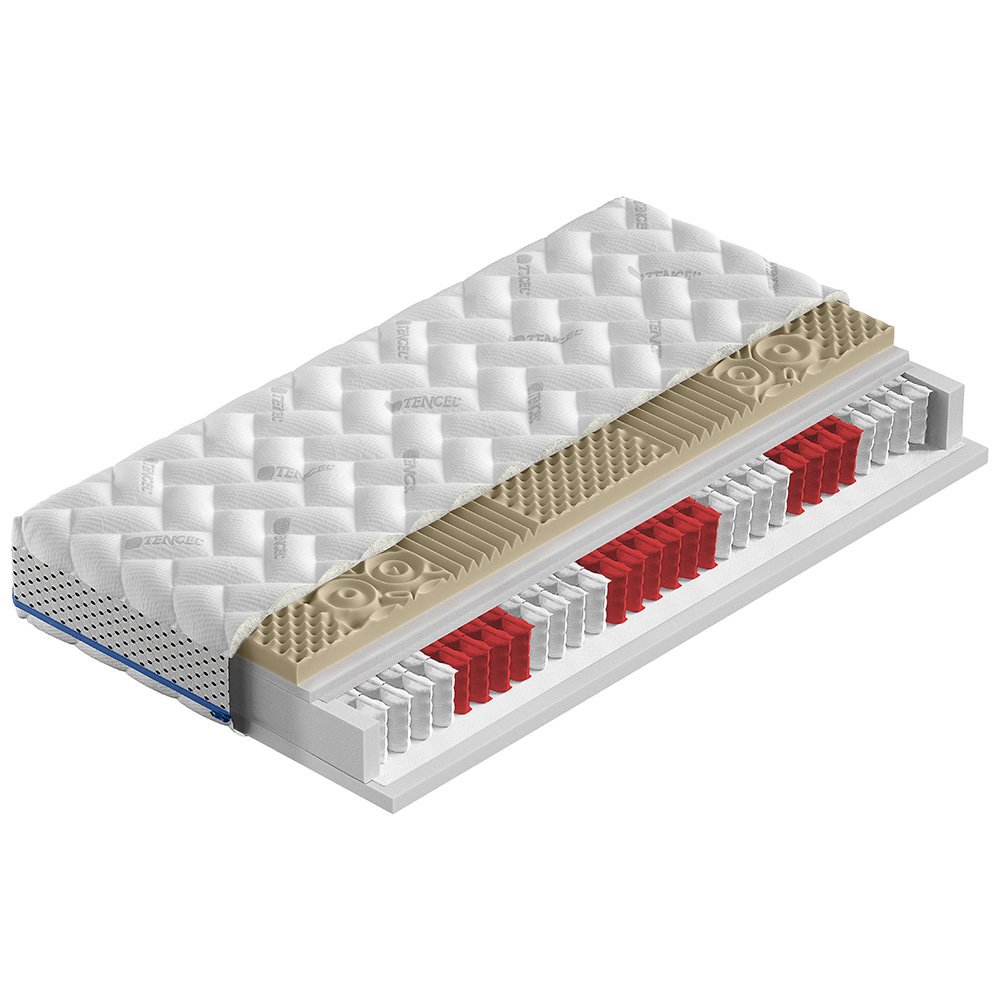 Dwustronny materac w specjalistycznym, wysokiej jakości pokrowcu Tencel, który absorbując wilgoć, pomaga zachować wysoki poziom higieny snu. Połączenie pianki termoelastycznej i sprężyn kieszeniowych daje gwarancję odpowiedniej regeneracji. Bardzo dobrze sprawdzi się jako materac dla seniora. Maya to materac kieszeniowy posiadający 7 stref twardości, dzięki którym nasz kręgosłup ma zapewnione odpowiednie podparcie na każdym jego odcinku. Przynosi ulgę obolałym plecom, redukuje wszelkie uciski. Z jednej strony materaca znajduje się pianka termoelastyczna, która idealnie dopasowuje się do wszystkich krzywizn naszego ciała, dając idealne podparcie. Z drugiej strony materaca zastosowano piankę Komfort, która jest elastyczna i wytrzymała. Dodatkowo moletowanie pianki termoelastycznej tworzy w materacu Maya tzw. strefy masujące, co poprawia krążenie oraz pozwala regulować temperaturę ciała podczas snu. Pokrowiec materaca posiada na całym obwodzie siatkę wentylacyjną 3D, zwiększającą jego właściwości antybakteryjne. Posiada zamek rozdzielczy 360 stopni, dzięki temu pokrowiec można bezproblemowo ściągnąć i wyprać w temperaturze nawet do 60 stopni Celsjusza.