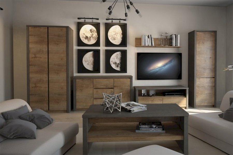 Nowoczesne meble pokojowe Montana dostępne są w dwóch wybarwieniach – dąb truflowy lub ciemny dąb lefaks. Kolekcja utrzymana jest w modnym, minimalistycznym stylu, a do jej wykonania użyto solidnej, laminowanej płyty ze wzmocnionymi obrzeżami ABS. Widoczna na płycie, wyraźna struktura drewna sprawia, ze meble wyglądają bardzo interesująco. Fronty pozbawione są uchwytów, co wpisuje się w nowoczesne trendy wzornictwa. Kolekcja Montana pozwala na stworzenie aranżacji stylowych, a dzięki pojemnym szafkom i komodom, również bardzo funkcjonalnych przestrzeni.