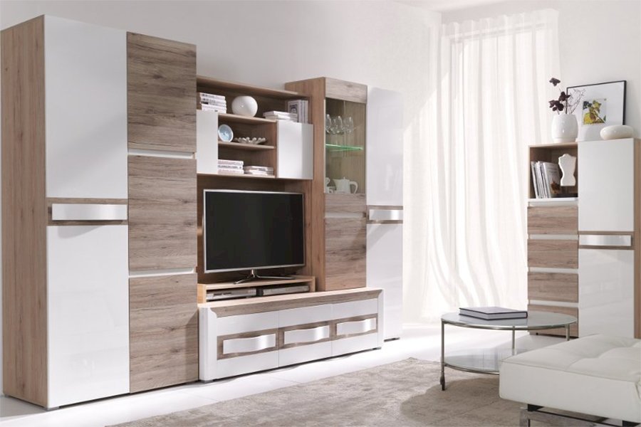 Nowoczesne meble pokojowe z kolekcji Passionata na pewno przypadną do gustu osobom, które lubią jasne, delikatne aranżacje. Proste kształty mebli w subtelny sposób urozmaicone są giętymi uchwytami, dzięki czemu bryła nie jest monotonna. Na uwagę zasługuje kolorystyka mebli, która w znakomity sposób łączy wybarwienia san remo jasne, san remo ciemne oraz białe akcenty z płyty o wysokim połysku. Meble Passionata wykonane zostały z wysokiej jakości płyty laminowanej z obrzeżami ABS. Elementy zestawu dostępne są oddzielnie lub w komplecie.