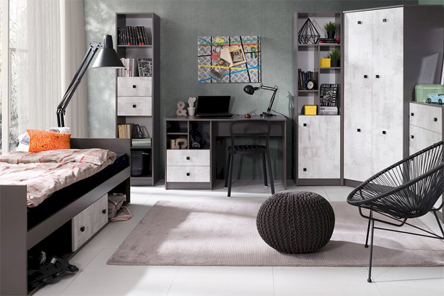 Meble młodzieżowe Tommy to wspaniała, nowoczesna kolekcja mebli dla dzieci i młodzieży. Meble wykonane są w ciekawym, jeszcze mało popularnym wybarwieniu Grafit + Enigma dzięki czemu będzie z pewnością przyciągało wzrok gości. Wiele elementów tej kolekcji pozwala na stworzenie aranżacji idealnie pasującej do meblowanego pokoju.