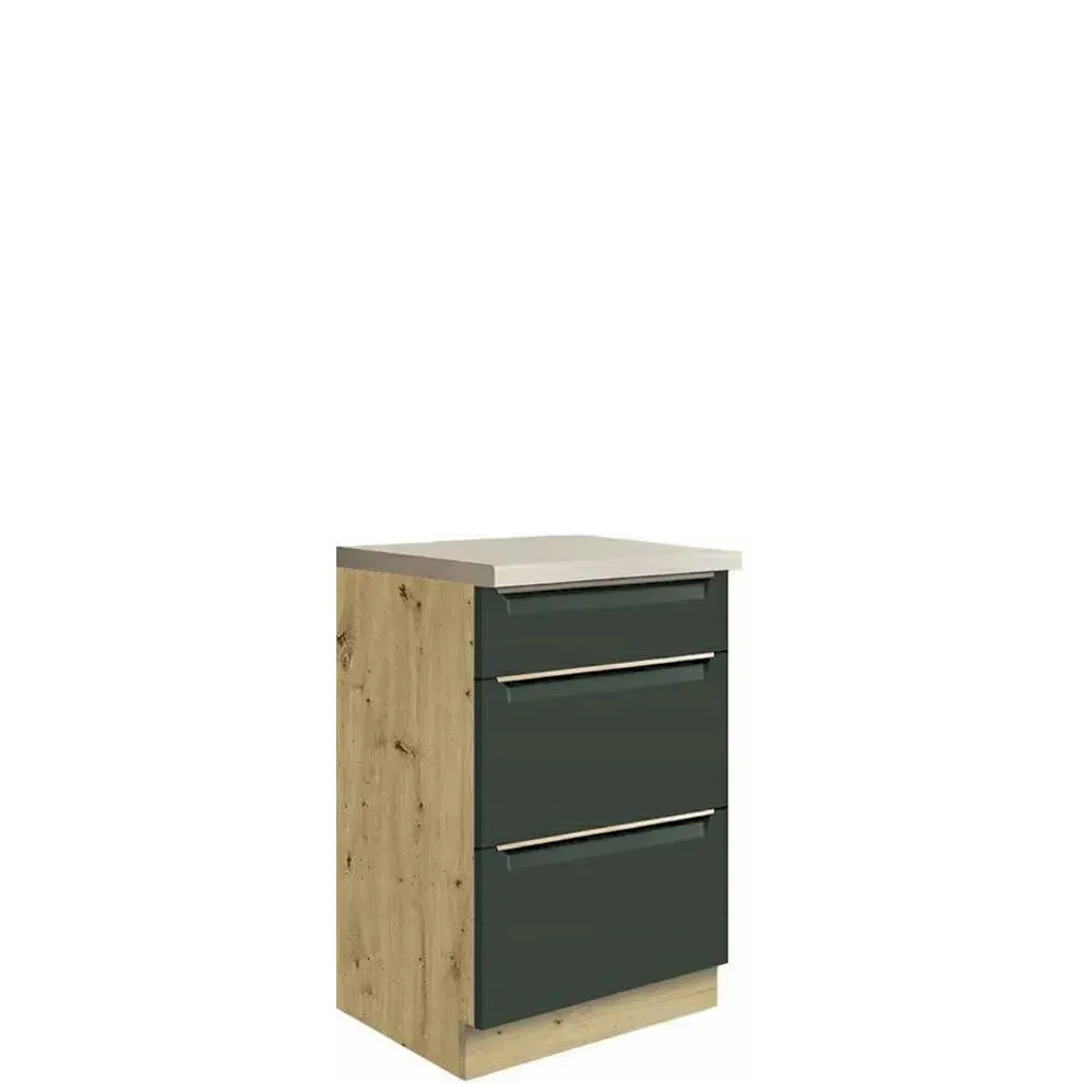 Glamour 9D oferuje możliwość personalizacji, umożliwiając wybór spośród trzech kolorów korpusu. Fronty występują w subtelnych odcieniach białego matu, głębokiego granatowego matu oraz świeżego zielonego matu, co pozwala dostosować kuchnię do własnych upodobań.