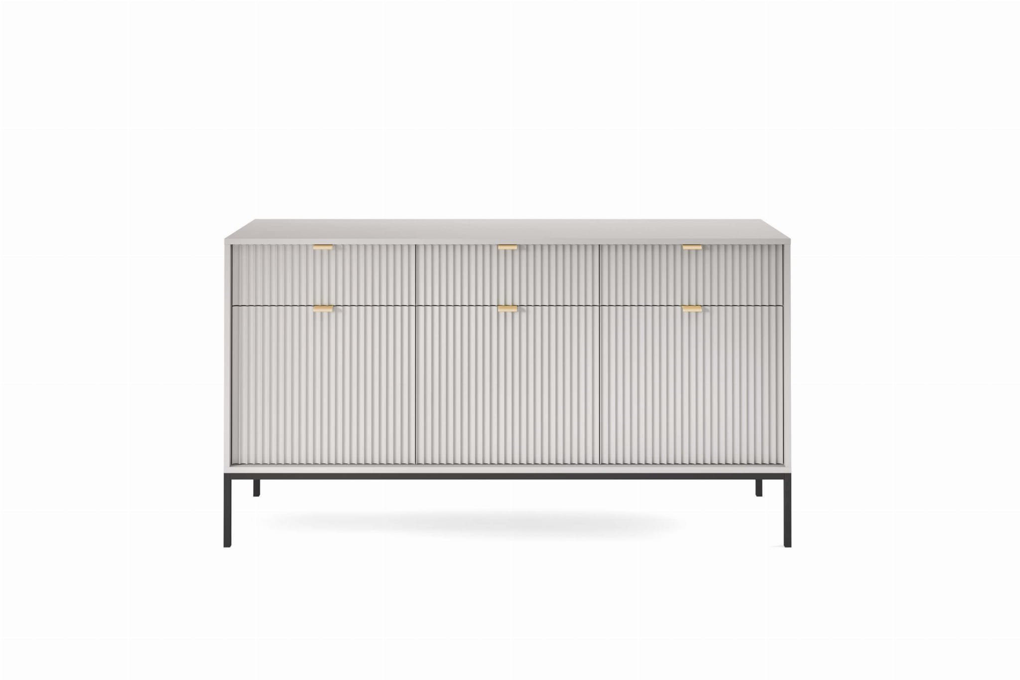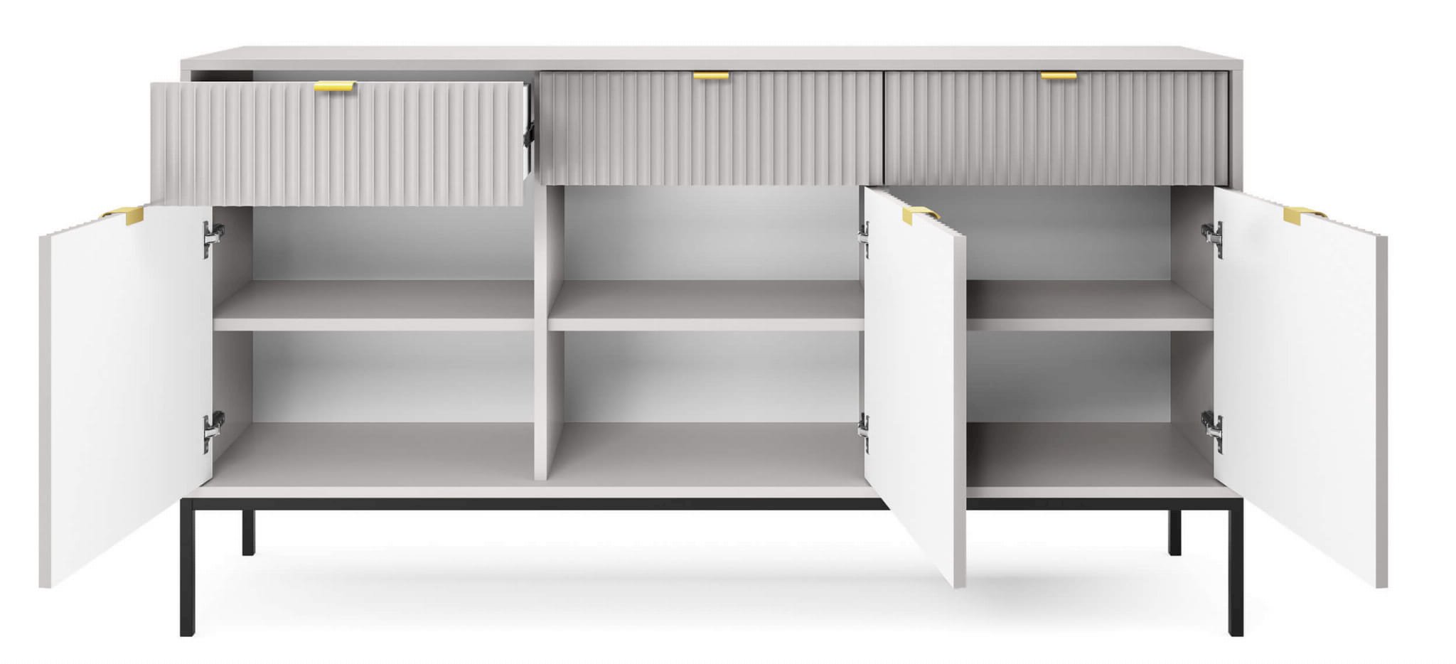 Cechą charakterystyczną dla systemu Nova są złote lub czarne uchwyty na krawędziach pięknych ryflowanych frontach. Kolekcja mebli pokojowych Nova występuje w trzech wersjach kolorystycznych: szarym, czarnym i białym - adekwatnie z kolorami korpusu. Wszystko uniesione na delikatnej podstawie dostępnej w dwóch wersjach kolorystycznych, czarnej oraz złotej.