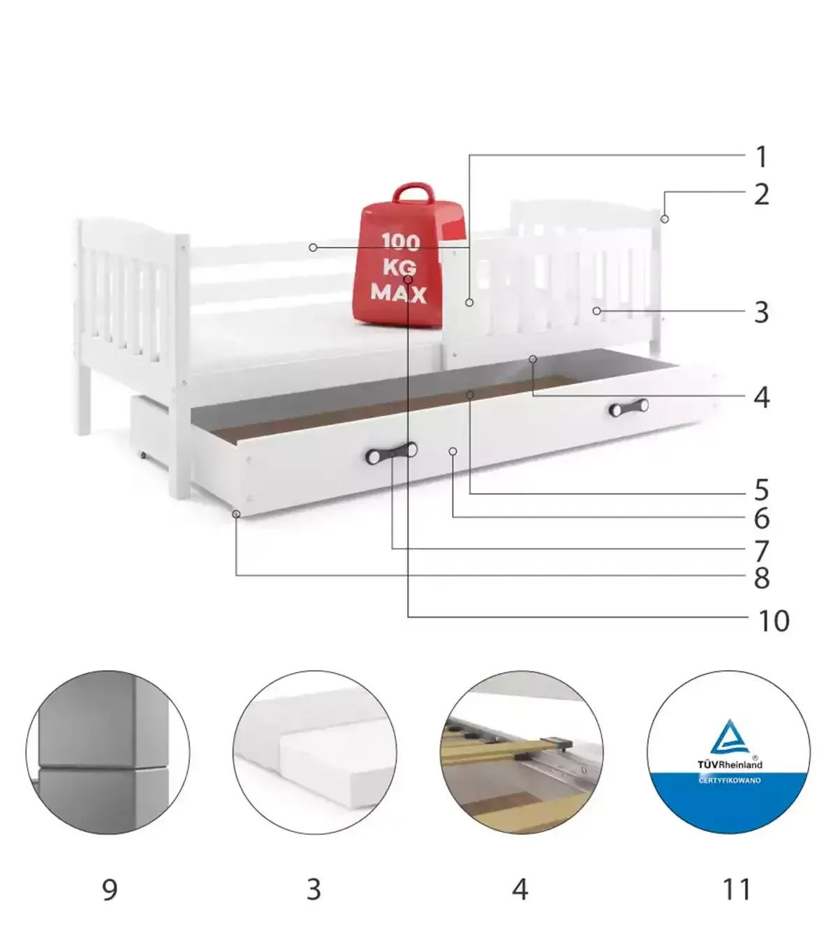 • Certyfikowane łóżko - jakość i bezpieczeństwo zgodnie z normami TUV. 11