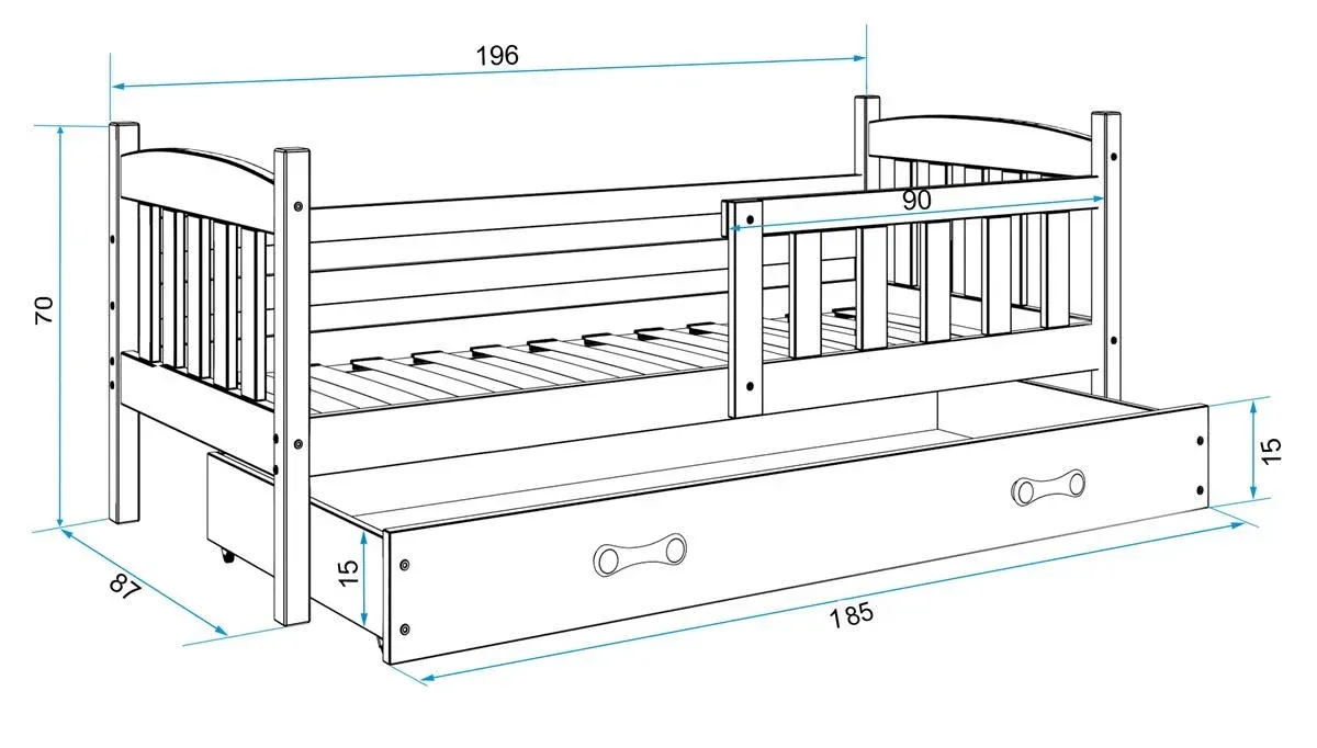 Nasze łóżko dla dziecka Kubuś to idealne połączenie funkcjonalności i stylu. Wykonane z trwałego drewna sosnowego, o powierzchni spania 90x200 cm, gwarantuje wygodę i bezpieczeństwo. Praktyczna szuflada pomieści pościel czy zabawki, a wysokiej jakości materac zapewni spokojny sen. Dostępne w kolorze białym, grafitowym i sosnowym, łóżko doskonale dopasuje się do każdego wnętrza, tworząc przyjemną przestrzeń dla Twojego dziecka. Stwórz wyjątkowe miejsce do snu i zabawy już dziś!