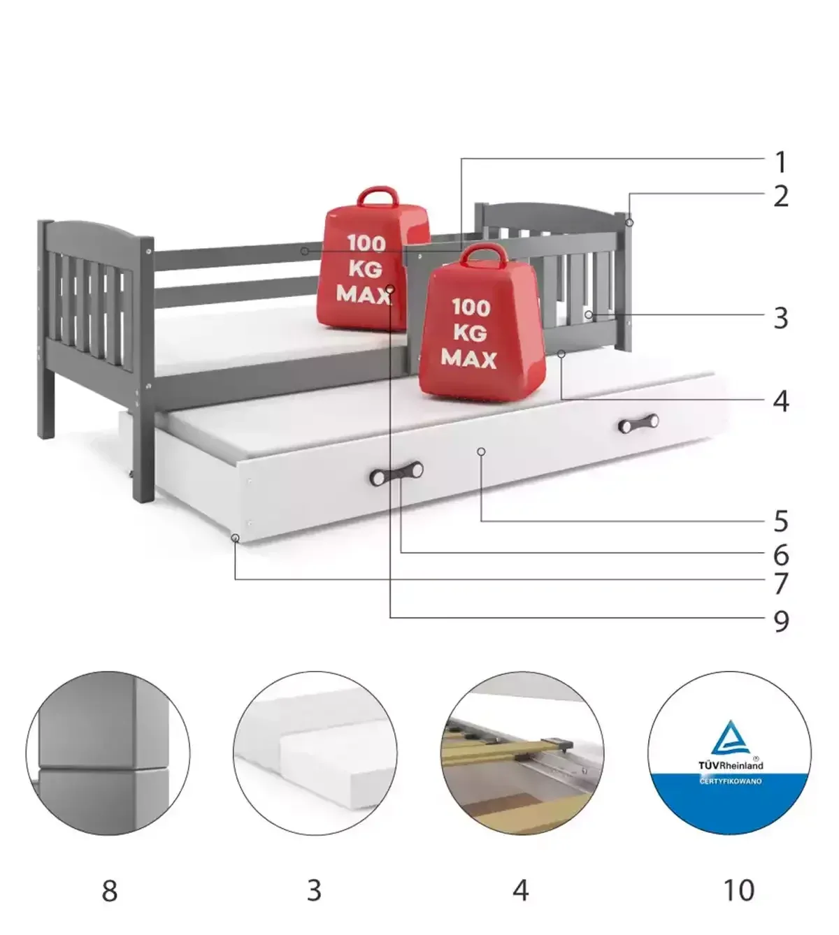 • Certyfikowane łóżko - jakość i bezpieczeństwo zgodnie z normami TUV. 10