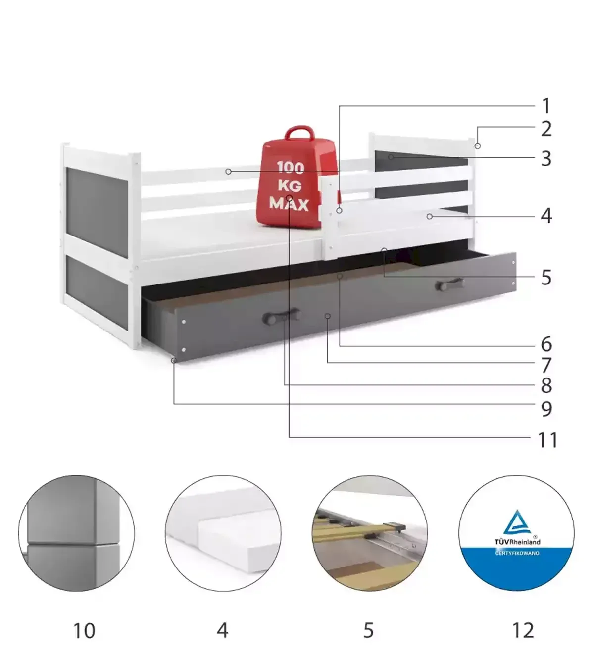 • Certyfikowane łóżko - jakość i bezpieczeństwo zgodnie z normami TUV. 12