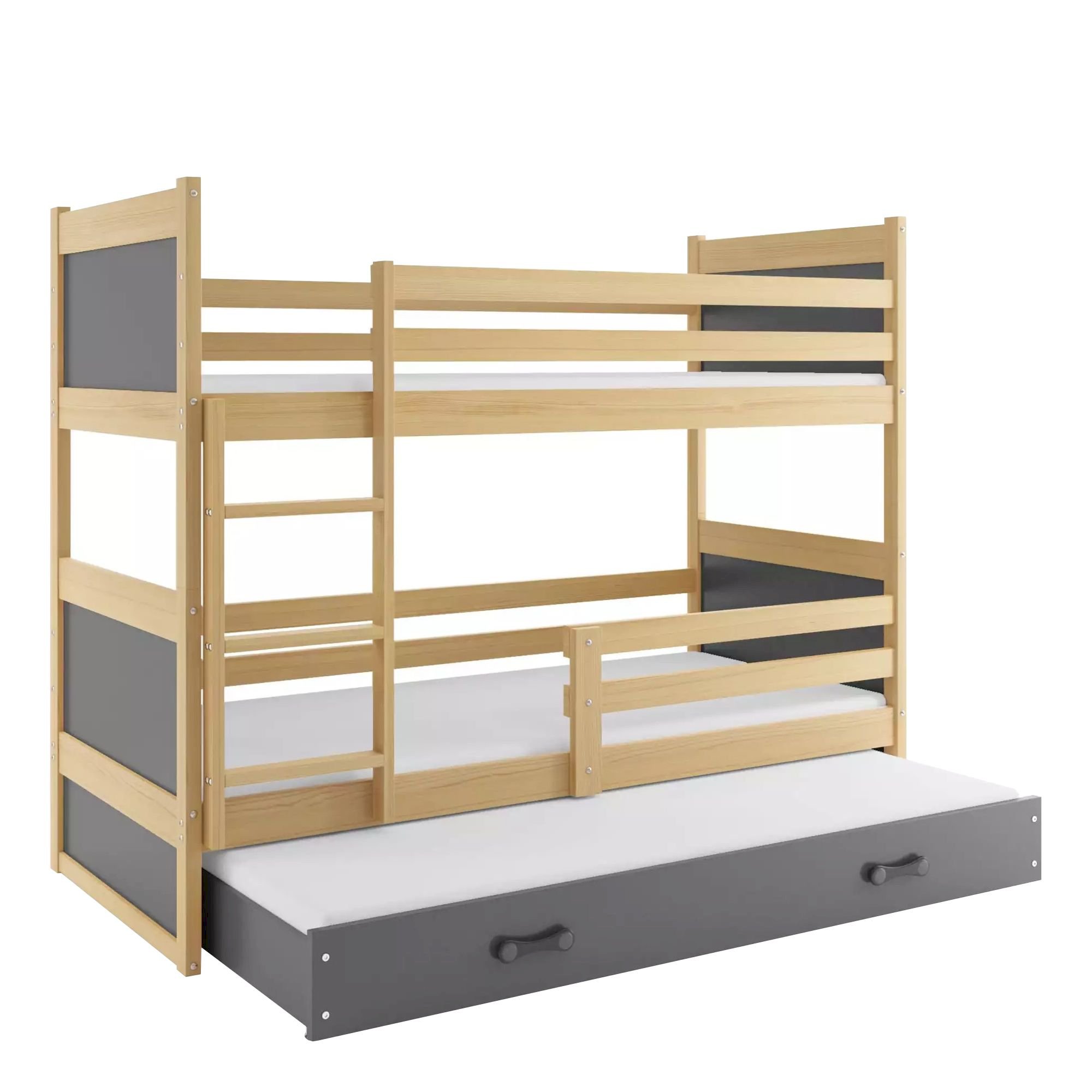 Łóżko piętrowe Rico to  trzyosobowa oaza komfortu i funkcjonalności. To wyjątkowe rozwiązanie wykonane z drewna sosnowego, dostępne w trzech stylowych kolorach białym, grafitowym i sosnowym, z subtelnymi wstawkami, które nadają mu charakterystyczny urok.