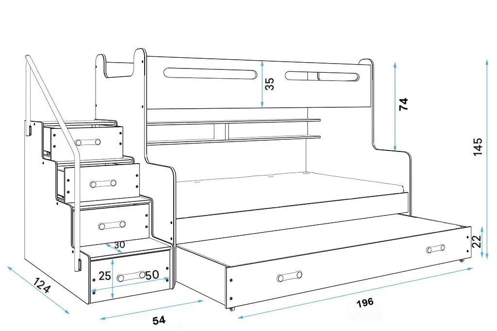 Przedstawiamy łóżko piętrowe Max 3, trzyosobowe miejsce snu, które łączy funkcjonalność z nowoczesnym designem. Korpus mebla wykonany jest z białej płyty MDF, co nadaje mu elegancki i świeży wygląd. Unikalnym elementem tego łóżka są stopnie, w których zamontowane są praktyczne szuflady. To nie tylko efektowne rozwiązanie, ale również funkcjonalny sposób na optymalne wykorzystanie przestrzeni w sypialni, umożliwiający przechowywanie różnych drobiazgów. Fronty łóżka oraz wstawki w uchwytach są dostępne w kilku kolorach - niebieskim, różowym, zielonym, białym i grafitowym. To pozwala dostosować łóżko do indywidualnych preferencji i stworzyć spersonalizowaną przestrzeń.