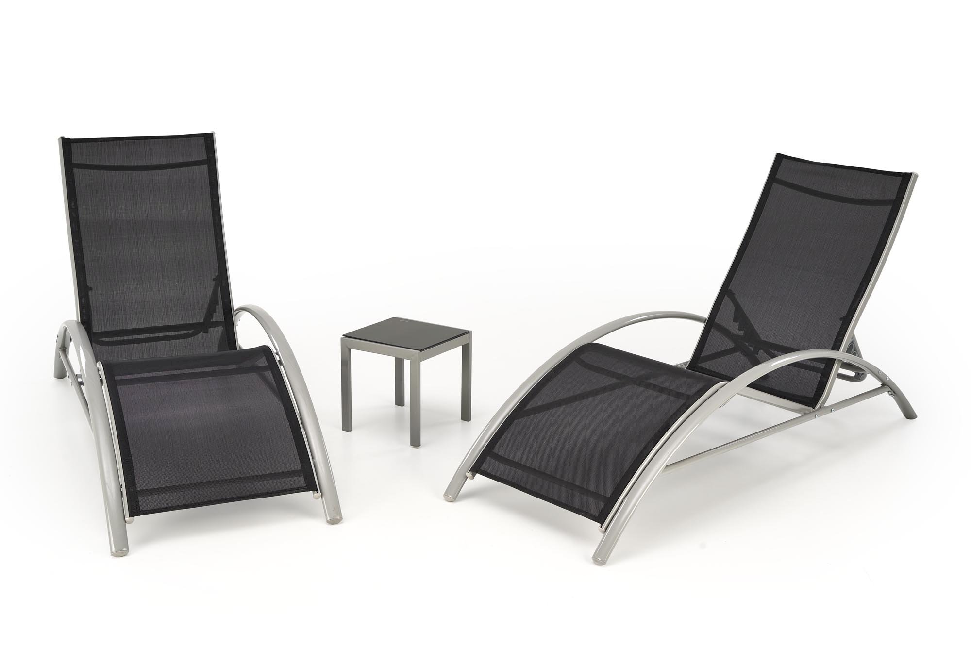 zestaw 2 leżaków ze stolikiem, wymiary: 160/60/66-92 cm - leżak, 30/30/30 cm - stolik, materiał: siatka / stal malowana proszkowo, kolor: czarny / jasny popiel
