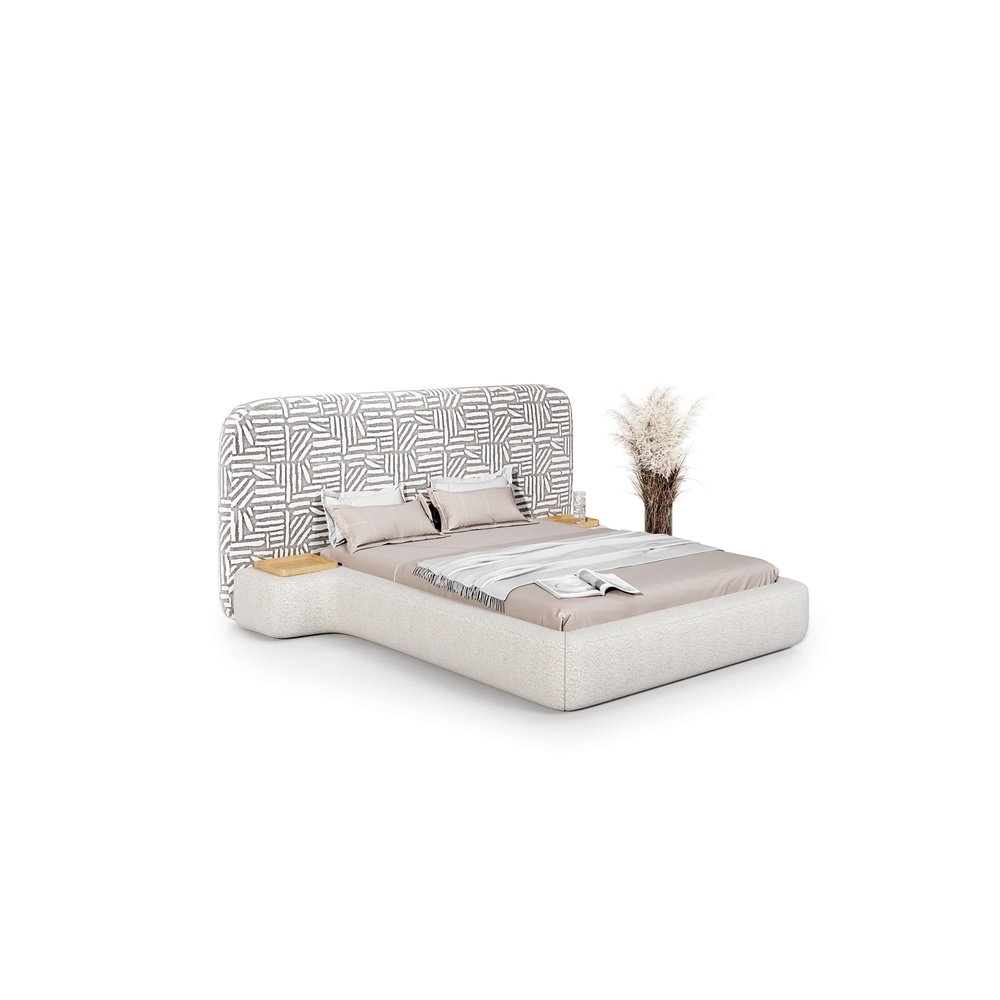 Wyjątkowym elementem są także drewniane stoliki w zestawie, zintegrowane z konstrukcją łóżka. Pełnią funkcję eleganckich półek nocnych – idealnych na książkę, filiżankę kawy czy telefon – jednocześnie podkreślając naturalny i luksusowy charakter mebla.