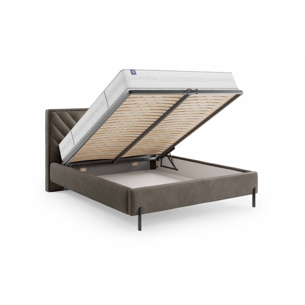 Łóżko Nashville marki Comforteo wyróżnia się designerskim zagłówkiem z przeszyciem, który nadaje wyraz sypialni, nowoczesny charakter. To stylowy akcent, który zwraca uwagę i podkreśla indywidualny charakter wnętrza. Smukła, tapicerowana bryła osadzona na nóżkach wygląda lekko i umożliwia wygodne sprzątanie robota. Model Nashville jest dostępny jako opcjonalnie z pojemnikiem na pościel, dzięki czemu łączy estetykę z praktycznym uchwytem.