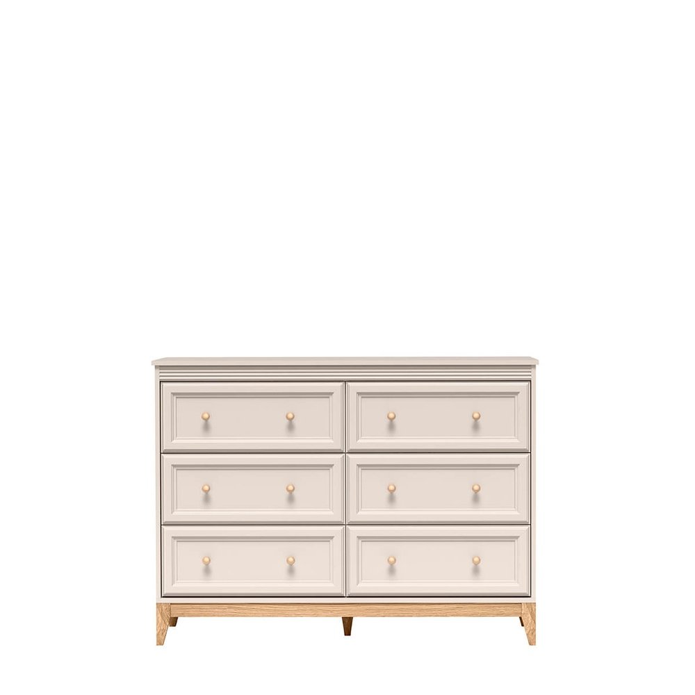 Elegancka i funkcjonalna komoda z sześcioma pojemnymi szufladami — doskonała propozycja dla osób ceniących zarówno styl, jak i dużą przestrzeń do przechowywania. Subtelny kaszmir i naturalne, drewniane detale tworzą ponadczasowy design, który odnajdzie się w salonie, sypialni czy korytarzu.