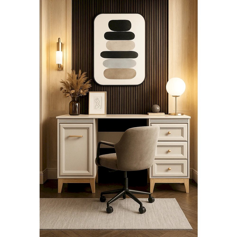 Eleganckie biurko z kolekcji Windsor łączy w sobie ponadczasowy design i praktyczną funkcjonalność, tworząc idealne miejsce do pracy w domu lub gabinecie. Wykonane w subtelnym odcieniu kaszmiru z ozdobnymi frontami i solidnymi, dębowymi nogami, prezentuje się stylowo i lekko. Biurko oferuje przestronny blat roboczy, pojemną szafkę z drzwiami oraz trzy praktyczne szuflady z systemem miękkiego domyku — doskonałe na dokumenty, akcesoria czy sprzęt biurowy. To mebel, który sprawdzi się podczas codziennej pracy, nauki lub jako stylowy dodatek do salonu i sypialni.