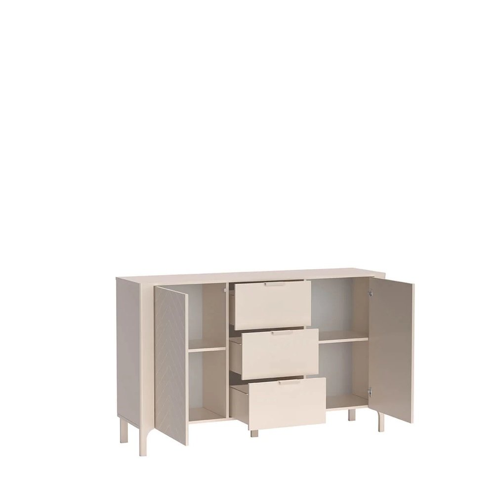 Elegancka i funkcjonalna komoda z frontami ozdobionymi wzorem w jodełkę – idealna do salonu lub sypialni. Trzy pojemne szuflady oraz dwie zamykane szafki zapewniają porządek i dużo przestrzeni do przechowywania. Stabilna konstrukcja i delikatne nóżki dodają lekkości aranżacji.