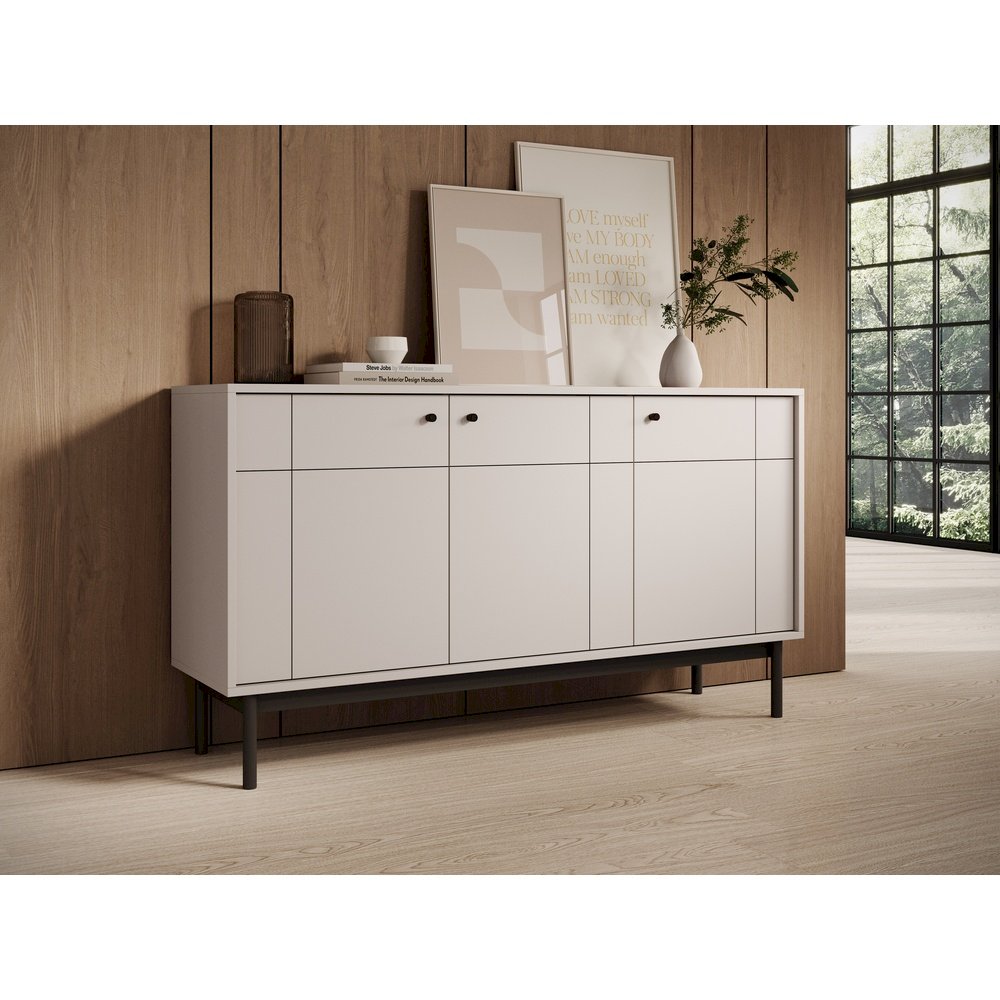 Komoda Japandi to minimalistyczna bryła inspirowana stylem japandi – prosta, proporcjonalna i wizualnie lekka. Korpus wykonany z wysokiej jakości płyty meblowej w dekorze kaszmiru nadaje wnętrzu ciepły, przyjazny charakter. Gładkie fronty bez zbędnych zdobień podkreślają nowoczesną estetykę, a funkcjonalny układ półek i szuflad zapewnia wygodną organizację przestrzeni w salonie lub sypialni.