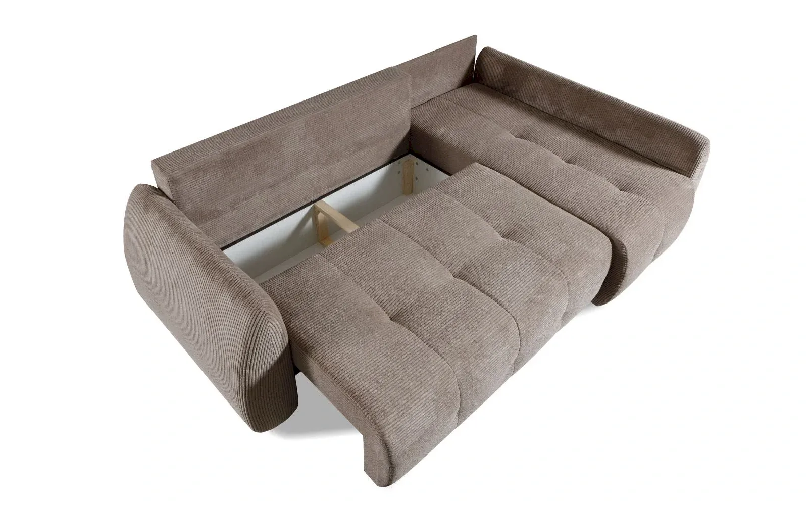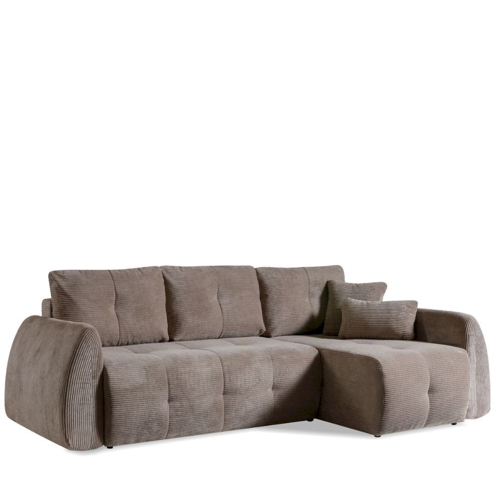 Mechanizm rozkładania umożliwia szybkie przygotowanie przestrzeni do spania, co sprawia, że LUNA nie jest tylko narożnikiem do siedzenia, ale także praktycznym miejscem noclegowym. Dodatkowy pojemnik na pościel pozwala zachować porządek w salonie, a jednocześnie przechowywać koce i poduszki w zasięgu ręki.