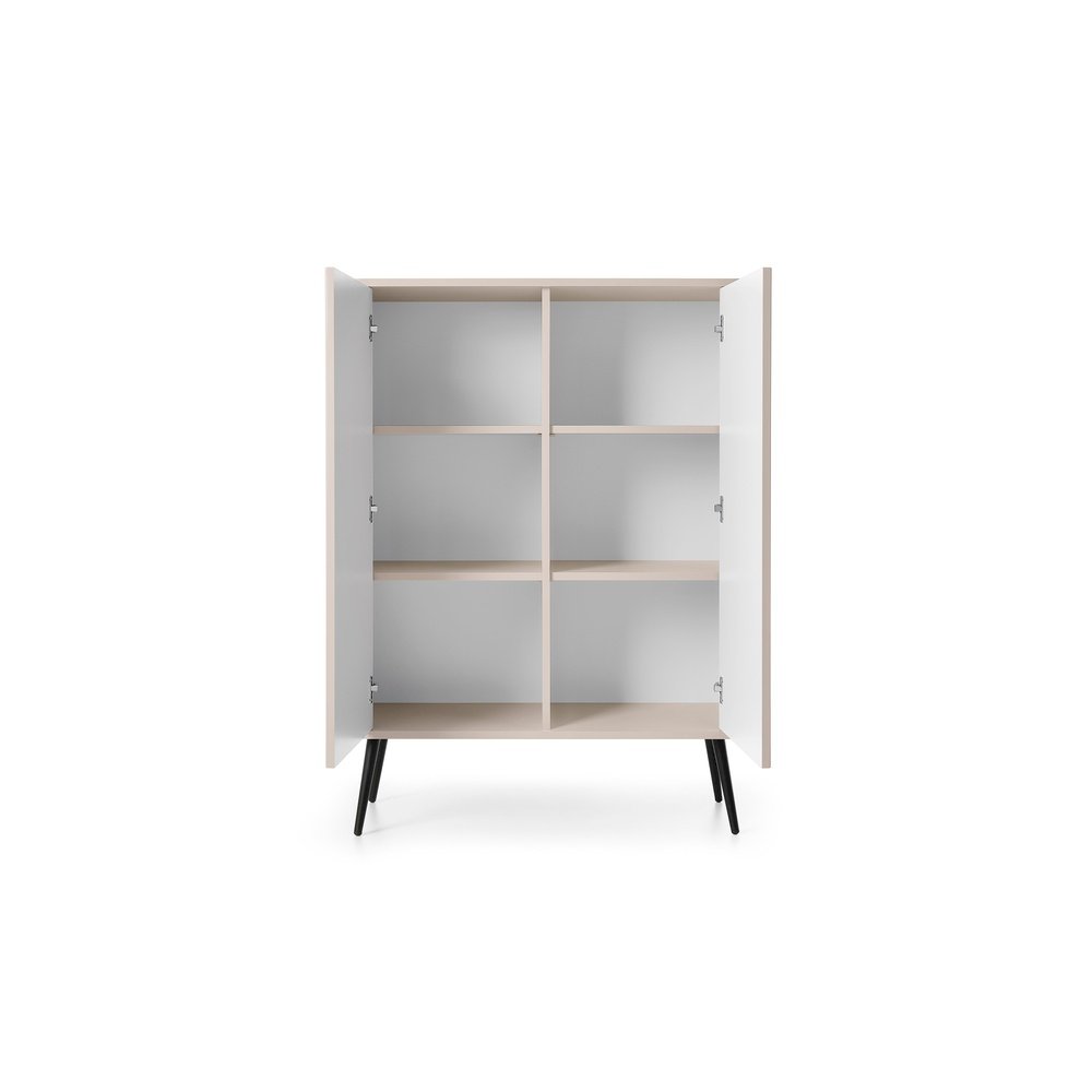 Komoda Zova 103 to kompaktowy, a zarazem pojemny mebel, który sprawdzi się zarówno w salonie, sypialni, jak i przedpokoju. Jej minimalistyczna forma została wzbogacona o eleganckie detale w postaci wysokich nóżek. Dzięki dostępności w trzech modnych kolorach – czarnym, białym i kaszmirowym – komoda doskonale wpisuje się w różne style wnętrzarskie. Możliwość wyboru czarnych lub złotych nóżek pozwala nadać jej bardziej wyrazisty lub subtelny charakter. Praktyczne wnętrze komody zapewnia wygodne przechowywanie ubrań, dokumentów czy domowych akcesoriów.