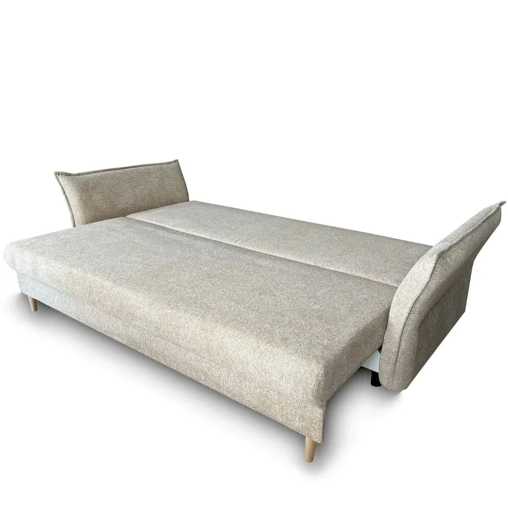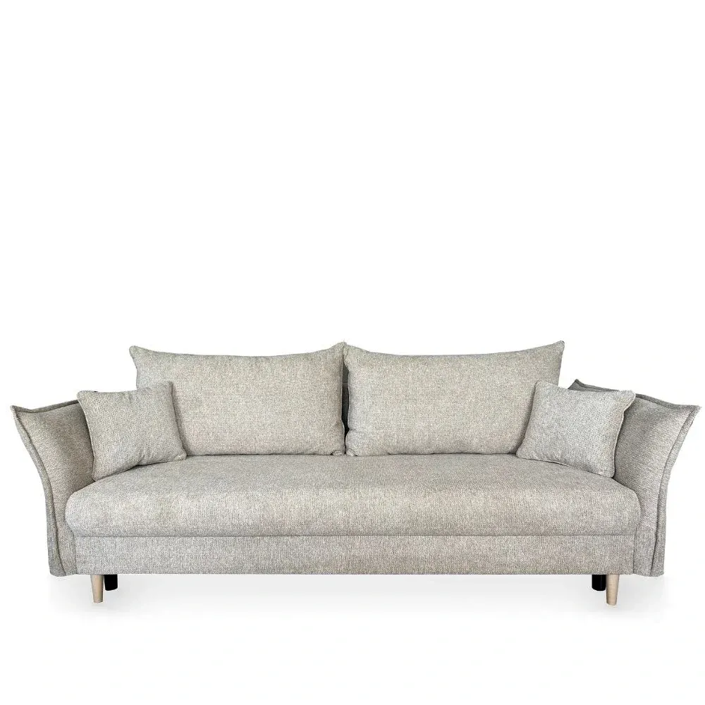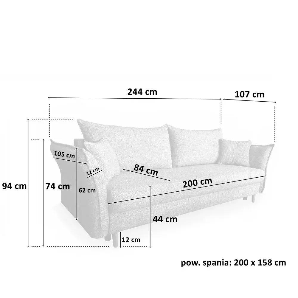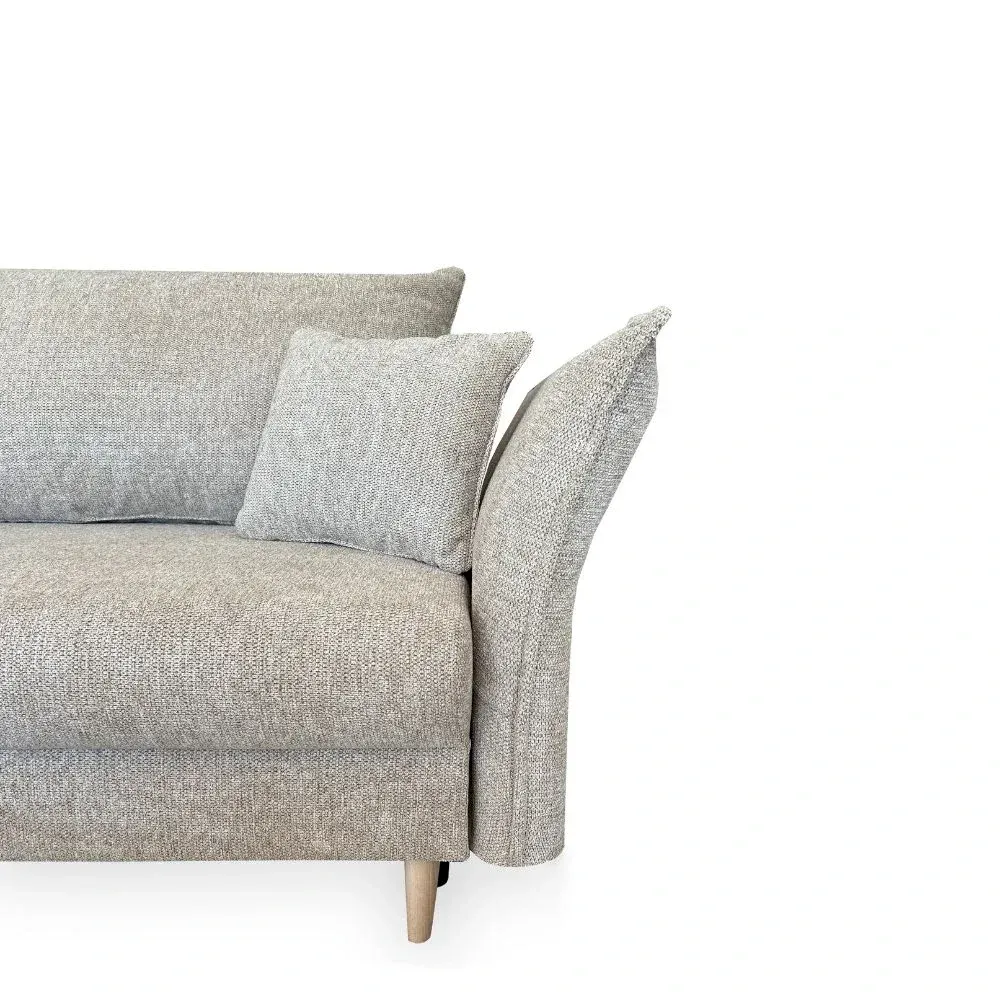 Szerokie, miękkie siedzisko zapewnia wygodę podczas codziennego odpoczynku, a trzy duże poduszki oparciowe gwarantują komfortowe podparcie pleców. Całość uzupełniają dekoracyjne poduszki boczne, które nie tylko zwiększają wygodę użytkowania, ale także nadają bryle lekkości i przytulności. Charakterystycznym elementem są zaokrąglone podłokietniki o miękkiej linii, które podkreślają nowoczesną formę mebla i dodają mu elegancji.