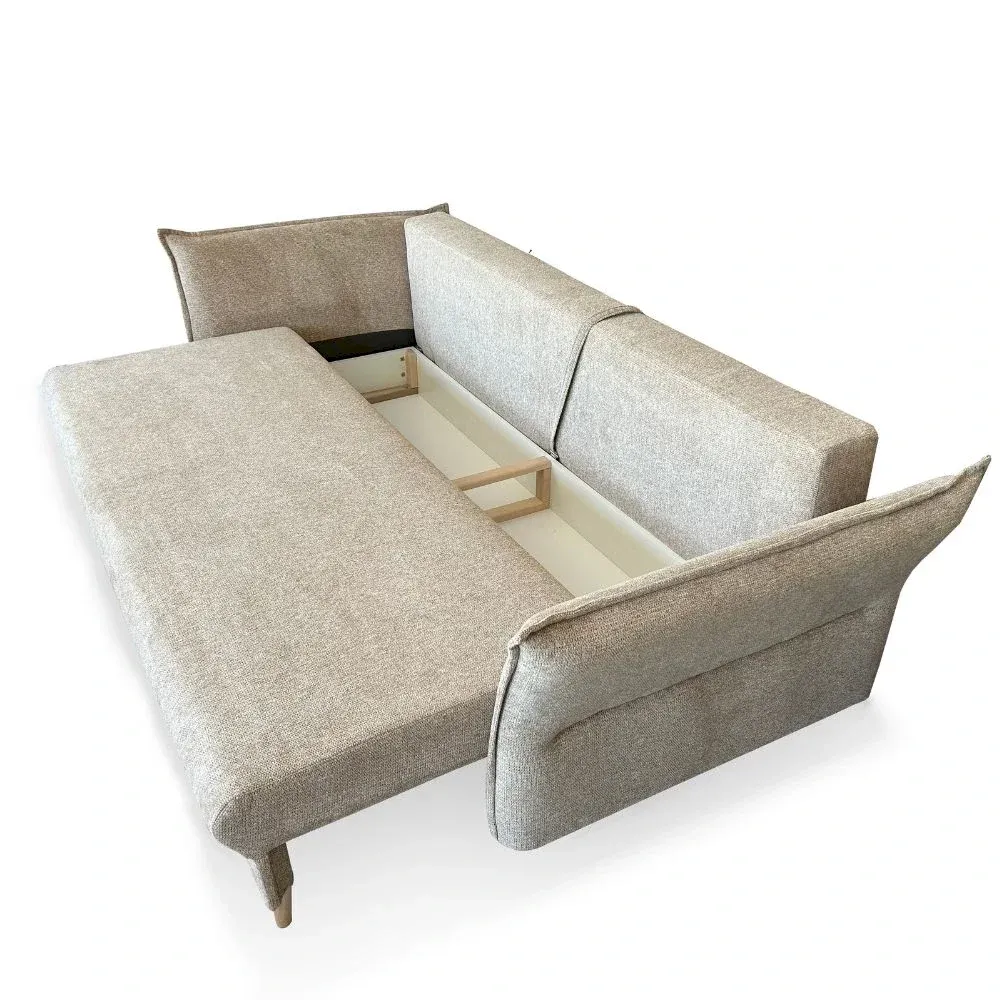 Tapczan osadzony jest na smukłych nóżkach w dwóch kontrastujących odcieniach – naturalnego drewna oraz czerni – co nadaje konstrukcji lekkości i subtelnie akcentuje jego designerski charakter. ROYAL to idealne rozwiązanie dla osób poszukujących wygodnego, stylowego i funkcjonalnego tapczanu do salonu lub pokoju dziennego.