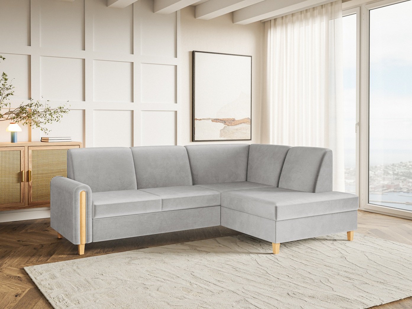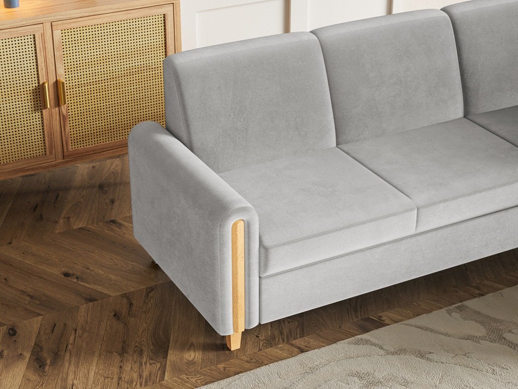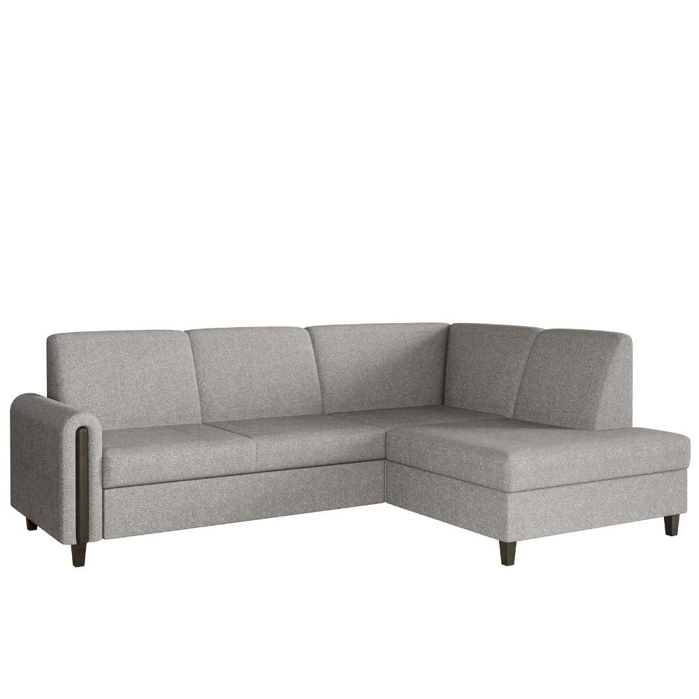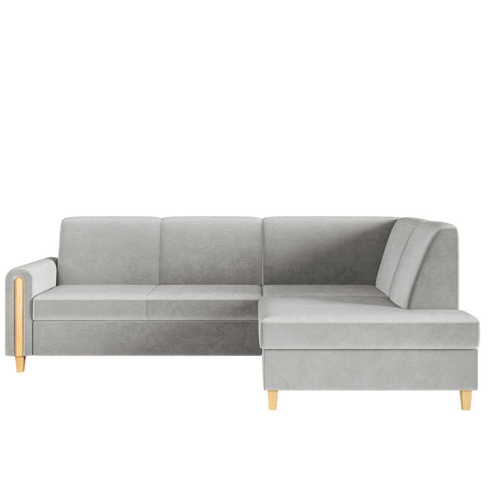 Unikalnym elementem konstrukcji są drewniane wstawki, które zdobią boczki narożnika, tworząc spójną kompozycję z wysokimi, toczonymi nóżkami z naturalnego drewna. Ten ciepły akcent dodaje meblowi szlachetności i domowego charakteru. Oparcie zaprojektowane z myślą o ergonomii zapewnia stabilne wsparcie, a miękkie, szerokie siedzisko zachęca do długich wieczorów z książką. Floryda to nie tylko mebel, to obietnica komfortu na najwyższym poziomie, zamknięta w formie, która nigdy nie wyjdzie z mody.