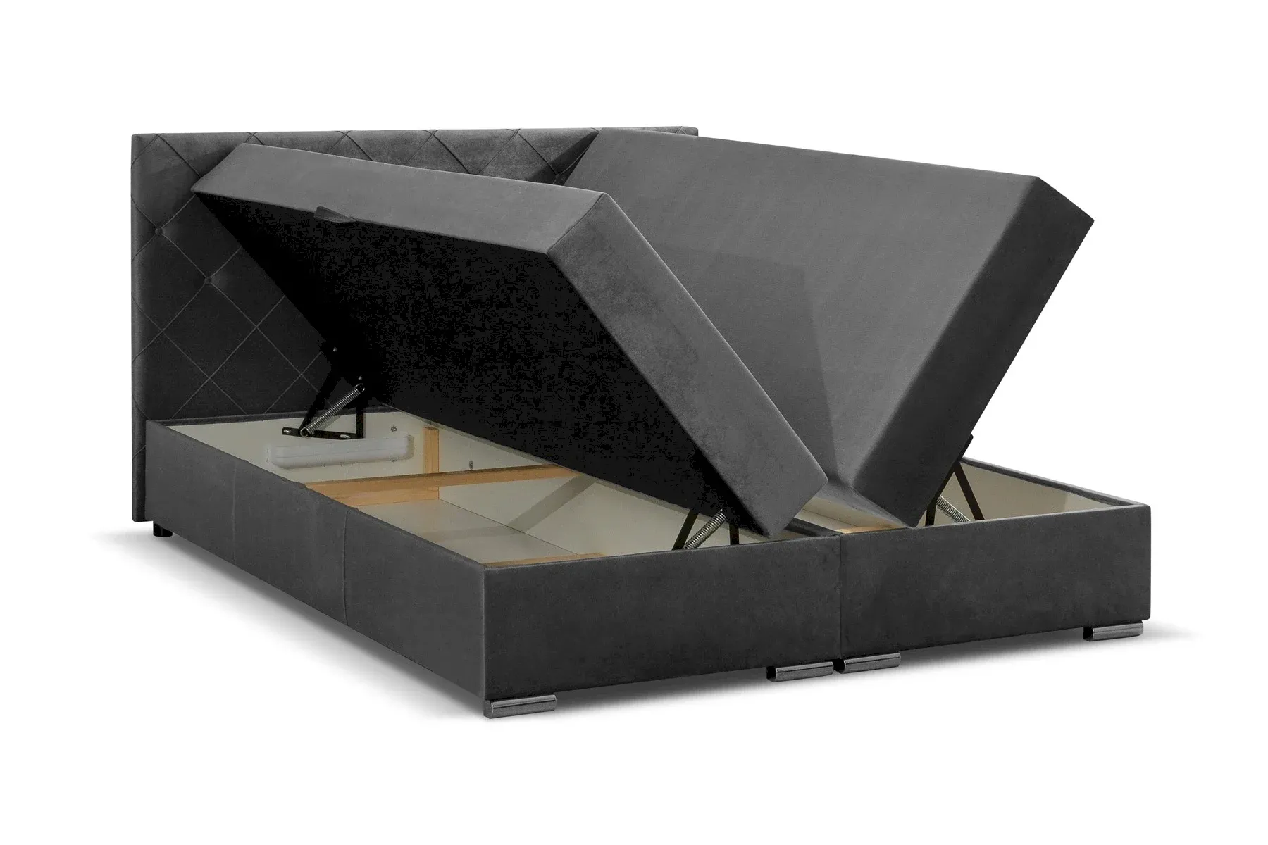 Model Malaga został zaprojektowany w systemie boxspring, co gwarantuje nie tylko imponującą wysokość spania, ale także optymalne wsparcie dla kręgosłupa dzięki wielowarstwowej strukturze. Funkcjonalność łóżka podnoszą zintegrowane pojemniki na pościel, do których dostęp ułatwiają zamontowane uchwyty, co czyni ten mebel idealnym rozwiązaniem dla osób ceniących porządek i ergonomię. Solidna, tapicerowana podstawa osadzona na niskich, chromowanych stopkach zapewnia stabilność i podkreśla prestiżowy wygląd mebla.